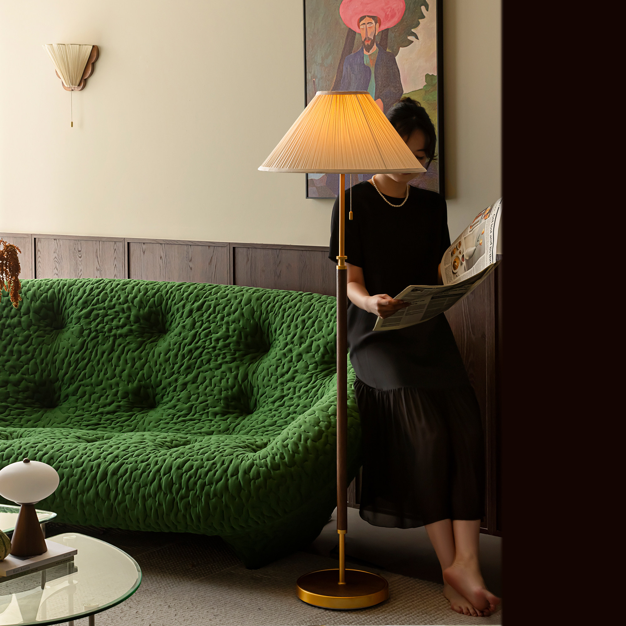 这款法式复古落地灯融合百褶灯罩与ins风设计,优雅浪漫,适合置于客厅沙发旁,为空间增添温馨氛围。灯体采用金属材质,线条流畅,搭配柔和暖光,营造慵懒惬意的居家感。同时,其简约造型亦契合新中式风格,可作为卧室床头立式台灯,兼顾实用与美学。无论是阅读、休憩还是装饰,都能提升整体空间质感。灯光透过褶皱灯罩散射,光影层次丰富,视觉柔和舒适。百搭的设计语言,轻松融入现代、复古或东方禅意家居环境,是提升生活品味的点睛之笔。