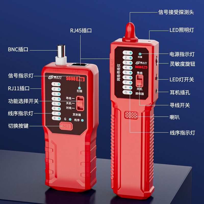 易之力S698强弱电寻线仪是一款专业级电工工具,支持3000米远距离寻线,适用于强弱电线路的快速识别与故障排查。该寻线器具备高精度信号发射与接收功能,可精准定位网线、电话线、电力线等金属导体的走向与断点,广泛应用于网络布线、家庭装修及电力维护场景。设备采用抗干扰设计,在复杂电磁环境中仍能稳定工作,支持通断测试、线路识别及带电检测,操作简便,响应迅速。配备高清LCD显示屏与声光提示,提升作业效率与准确性。易之力S698兼具耐用性与便携性,是电工、网络工程师及维修人员的理想选择,助力高效完成线路检测与维护任务。