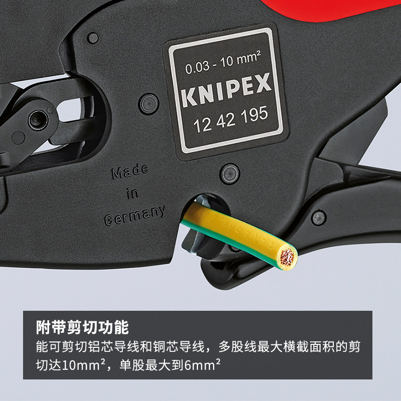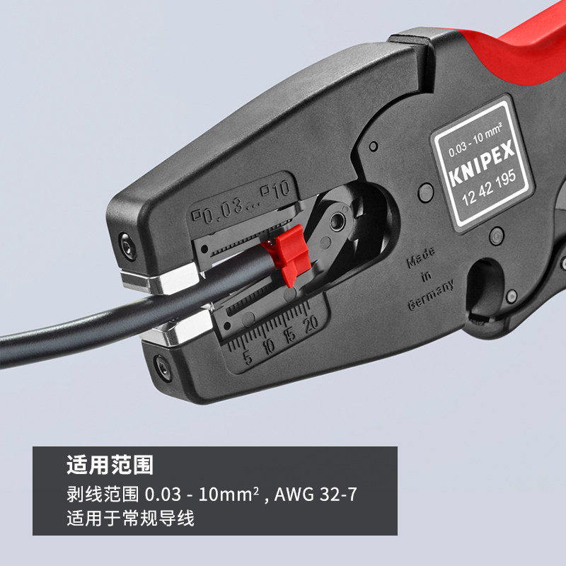 KNIPEX德国凯尼派克MultiStrip 10自动剥线钳(型号1242195)是一款高效精准的专业剥线工具,专为电工和维修技术人员设计。采用德国精工制造,具备自动感应导线直径并精准调节剥线深度的功能,避免损伤导体。适用于直径0.08至10 mm²(AWG 28–8)的单芯、多芯及细绞合导线,支持绝缘层快速剥离且切口平整。钳口集成切线功能,一钳多用,操作便捷省力。人体工学手柄防滑舒适,提升长时间作业体验。MultiStrip 10以卓越的耐用性、高精度和可靠性著称,是电气安装与维护的理想选择,彰显KNIPEX在专业工具领域的领先地位。