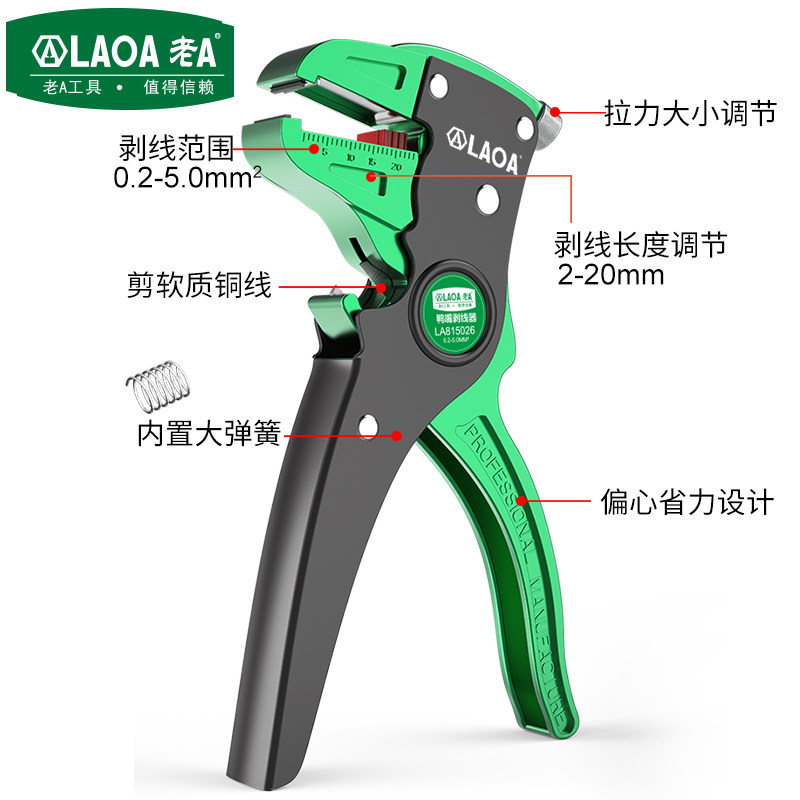 台湾原装进口老A电工剥线钳,是一款集剥线、剪线、压接于一体的多功能自动工具。采用优质高碳钢精工锻造,刀刃锋利耐用,经久不钝。独特的鸭嘴(鹰嘴)设计,便于在狭小空间精准操作,提升作业效率。自动调节剥线口径,适配多种规格电线,剥线整齐不伤导体。手柄符合人体工学,握感舒适,防滑省力。适用于电工、通信、家电维修等专业领域,是技术人员值得信赖的高效工具。凭借台湾精湛工艺与严格品控,老A剥线钳以卓越品质赢得广泛信赖,是专业与实用的完美结合。