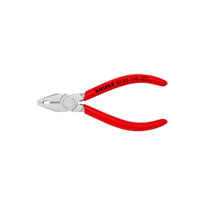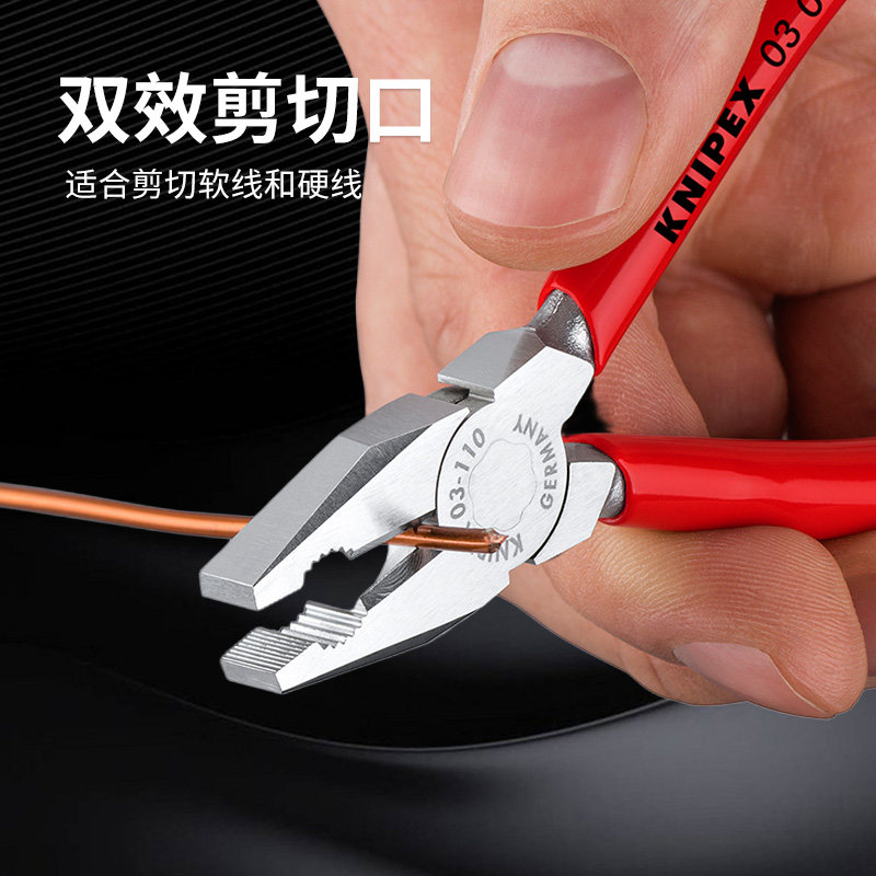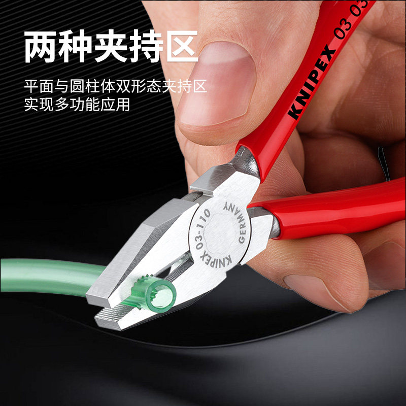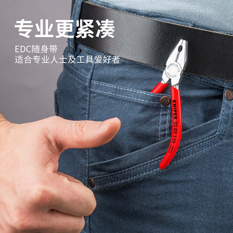 【新品推荐】KNIPEX德国凯尼派克4寸迷你钢丝钳(型号:0303110),集精密工艺与实用性能于一体。采用高品质铬钒钢锻造,硬度高、耐磨损,剪切力强,轻松应对细钢丝、软金属线等作业。人性化防滑手柄设计,握感舒适,操作省力,适合狭小空间精细作业。尺寸小巧便携,是电工、维修技师及DIY爱好者的理想之选。源自德国精工制造,品质可靠,经久耐用。无论是家庭日常维修还是专业工程应用,这款迷你钢丝钳都能精准胜任,展现KNIPEX一贯的卓越品质与匠心精神。