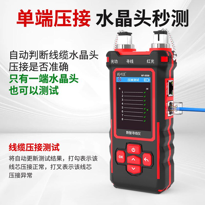 精明鼠寻线仪8508是一款集多功能于一体的智能网络检测工具,专为网络工程、安防安装及弱电维护人员设计。它集成了寻线、测线、光功率检测、红光笔定位及POE电压测试五大核心功能,支持快速识别网线、电话线及光纤线路,有效提升排查效率。设备具备强抗干扰能力,可在复杂电磁环境中精准巡线,避免误判。红光笔功能支持光纤通断检测与故障定位,光功率计可实时测量光信号强度,确保网络传输稳定。POE测试功能可检测供电电压与极性,保障设备安全。体积小巧、操作简便,是网络运维人员的得力助手。