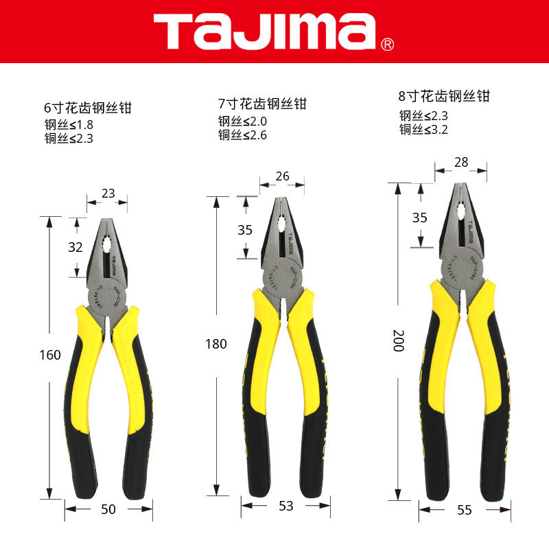 田岛(Tajima)钢丝钳、老虎钳、断线钳及尖嘴/斜嘴钳,采用优质合金钢锻造,硬度高、耐磨性强,适用于多种作业场景。6、7、8英寸多种规格可选,满足不同操作需求。钳口精密加工,咬合紧密,剪切力强,可轻松处理钢丝、铁丝、电线等硬质材料。人体工学手柄设计,握感舒适,防滑省力,长时间使用不易疲劳。兼具多功能性,集夹持、剪切、弯曲于一体,广泛应用于电工、维修、建筑等领域。田岛工具以精湛工艺和可靠品质著称,是专业技工与DIY爱好者的理想之选,兼顾高效作业与持久耐用。