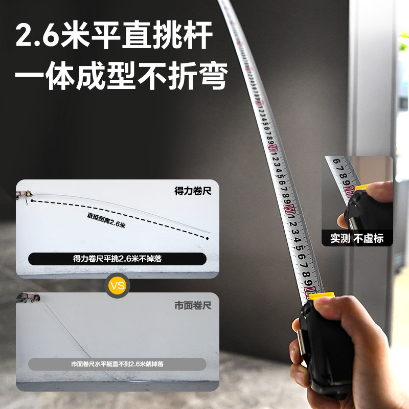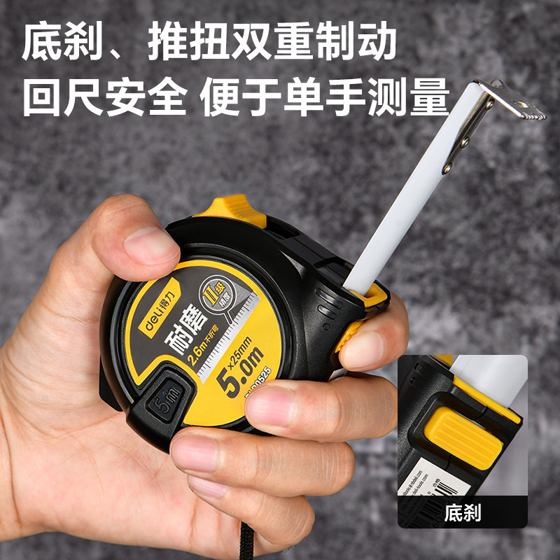 得力卷尺是一款专为家庭使用设计的高精度测量工具,提供5米、7.5米和10米多种规格,满足不同场景需求。采用加厚高碳钢带,表面覆有清晰耐磨刻度,确保测量精准、持久耐用。尺带经过加硬处理,抗弯折、不易变形,回弹顺畅有力。外壳为坚固工程塑料,防滑抗摔,握感舒适。配备自动锁定装置,方便固定长度,提升使用效率。无论是装修、木工还是日常测量,这款卷尺都表现出色,是家庭工具箱中的实用之选。得力品牌保障,品质可靠,性价比极高。