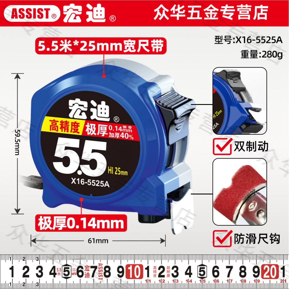 ASSIST宏迪钢卷尺公制卷尺加厚尺带高精度抗摔耐磨尺子5.5米3.5米
