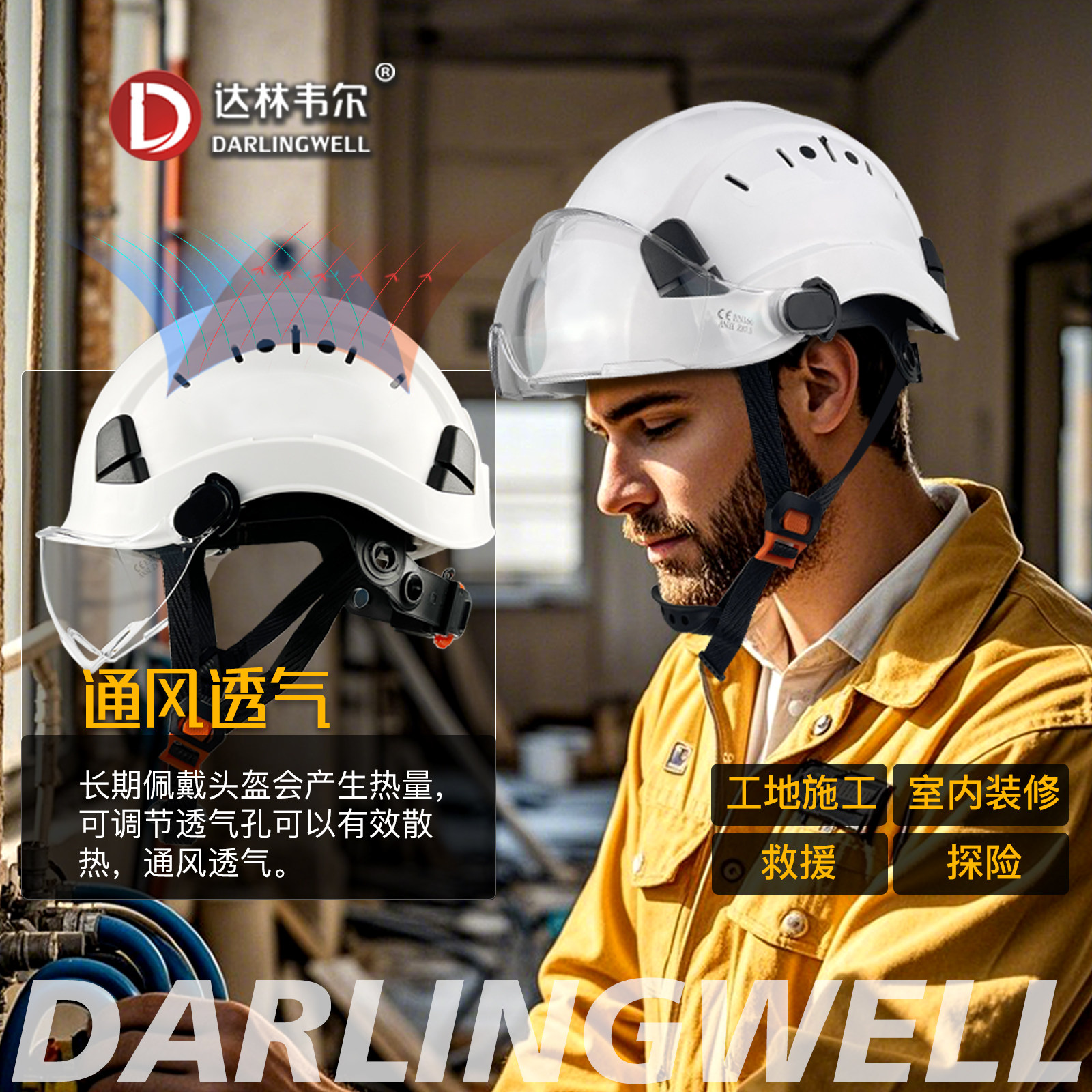 达林韦尔防砸工地安全帽是一款符合国家标准的高品质建筑安全盔,专为施工现场设计。采用高强度ABS工程塑料材质,具备优异的抗冲击和防砸性能,有效保护头部安全。配备可调节内衬,佩戴舒适稳固,并融入透气孔设计,提升通风散热效果,适合长时间作业。安全帽侧面集成防雾护目镜,可灵活收放,有效防护飞溅物和粉尘,保障眼部安全。帽体支持定制企业LOGO印字,彰显品牌形象。广泛应用于建筑、电力、制造等行业,是工地必备的优质劳保防护用品,兼顾安全性、舒适性与实用性。