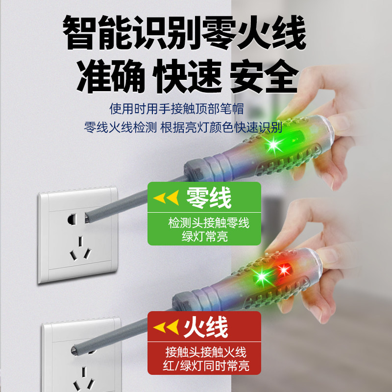 这款电笔电工专用测断线高亮彩光多功能智能感应检测验电试电笔螺丝刀,集验电、断线检测、智能感应与螺丝刀功能于一体,专为电工日常作业设计。采用高灵敏度非接触式感应技术,可快速识别带电线路,并通过彩色LED灯光清晰显示电压状态,夜间作业更安全便捷。内置高亮照明灯,便于暗处操作。同时具备断线查找功能,精准定位线路故障点。笔身集成精密螺丝刀头,满足多种维修需求。绝缘材料外壳,符合安全标准,握感舒适,耐用性强。适用于家庭、工厂、装修等多种场景,是电工师傅高效、安全作业的理想工具。