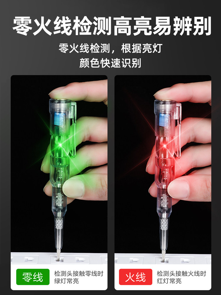得力电笔是一款专为电工设计的智能多功能测电笔,集感应测电、断线检测、验电等功能于一体,适用于家庭及专业电工场景。采用高灵敏度感应技术,可非接触式检测电线是否带电,安全便捷。配备高亮彩光显示,红绿双色清晰指示电压状态,夜间操作更直观。内置智能芯片,自动识别火线、零线,并支持断点查找,精准定位线路故障。笔身符合人体工学设计,防滑耐用,操作简便。无论是日常家用检修还是专业电路维护,得力电笔都以高效、安全、智能的表现,成为电工师傅和家庭的得力助手,是电路检测的理想选择。