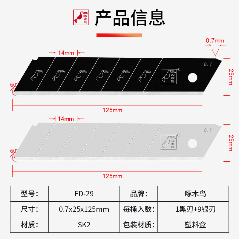啄木鸟美工刀片FD-06重型加厚壁纸刀片0.7mm厚宽18工业用刀片锋利