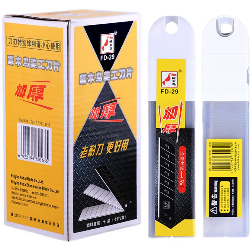 啄木鸟刀片FD-29是一款专为重型作业设计的大号加宽美工刀片,宽度达25mm,厚度0.7mm,具备出色的抗弯强度和耐用性。采用优质高碳钢材质,经精密研磨工艺打造,刃口锋利持久,可轻松切割壁纸、墙纸、皮革、硬纸板等多种材料。加宽刀身设计提升稳定性,减少切割偏移,适合长时间高强度使用。适用于装修、手工制作、包装等行业,是专业工匠和DIY爱好者的理想选择。刀片符合标准尺寸,兼容多数通用美工刀架,安全便捷。FD-29以卓越性能和可靠品质,助力高效精准作业。