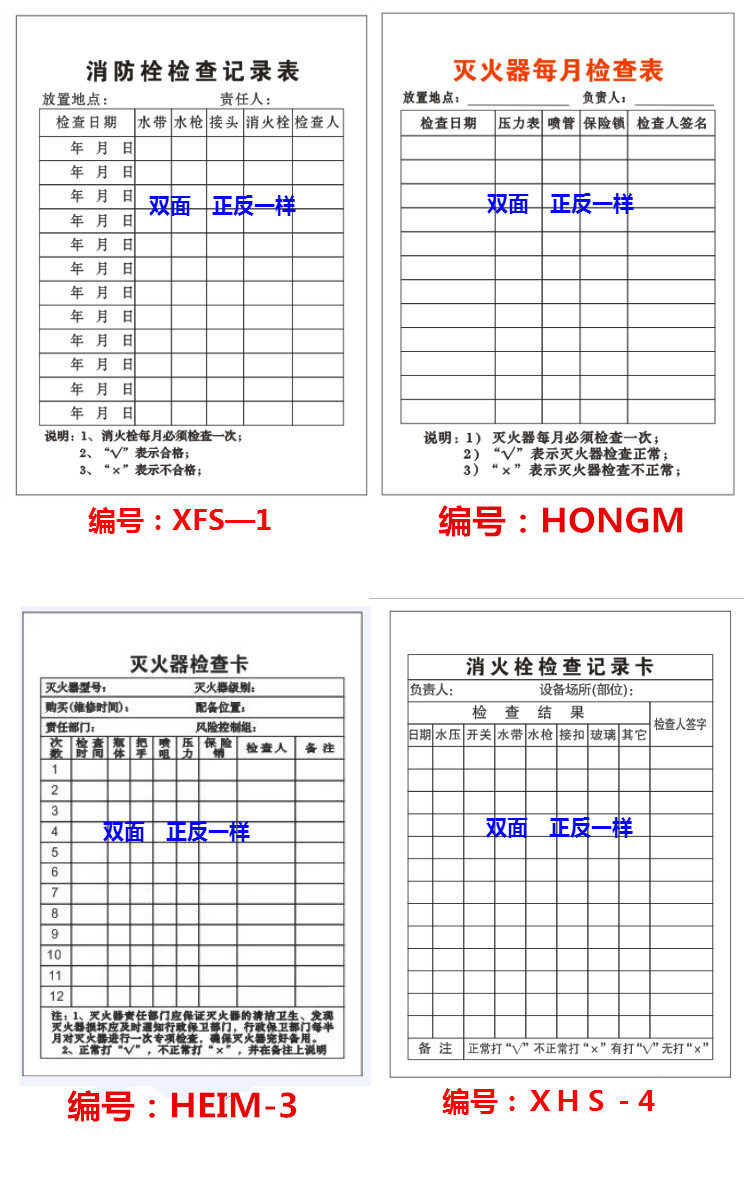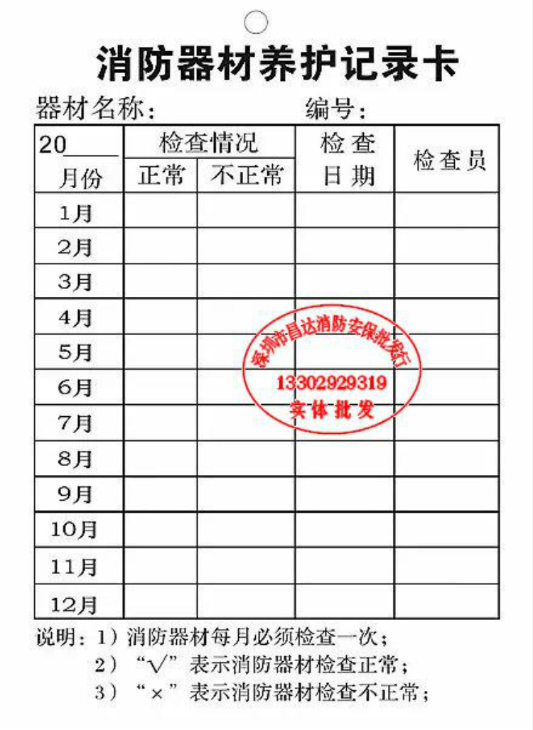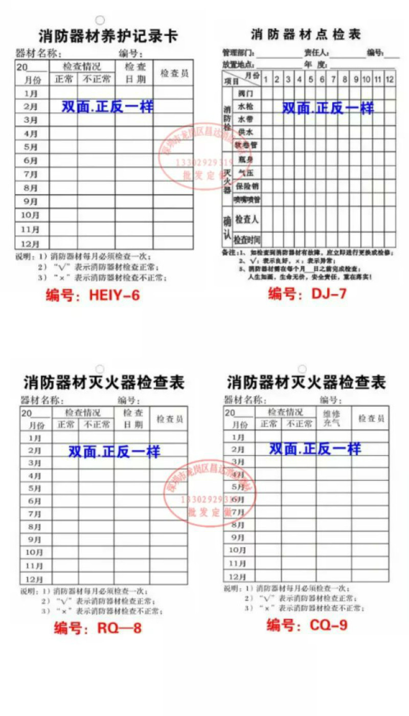 灭火器检查卡、养护记录卡片、安全标识、标志标牌及消防安检标示牌保养卡是消防安全管理的关键环节。这些卡片和标识用于规范灭火器的日常检查、维护与保养流程,确保设备处于完好可用状态。检查卡通常记录检查日期、压力状态、外观完整性及责任人签字;养护记录卡则详细记载维修、充装、更换等信息。配套的消防标识标牌清晰标明灭火器位置、使用方法及注意事项,提升应急响应效率。定期更新保养卡并张贴醒目标识,不仅符合消防法规要求,也有助于日常巡检和隐患排查,切实保障人员生命财产安全,是单位消防安全管理的重要基础工具。