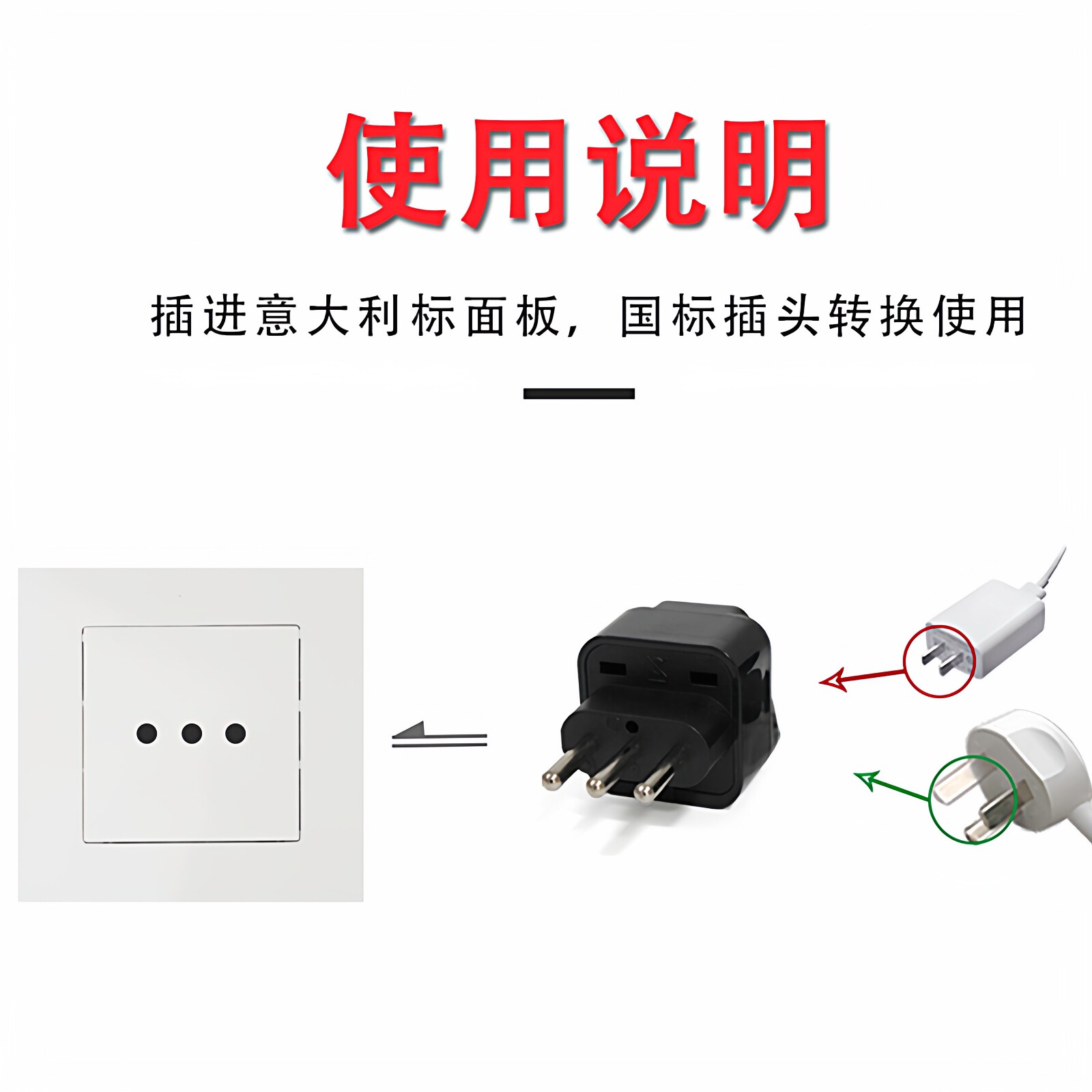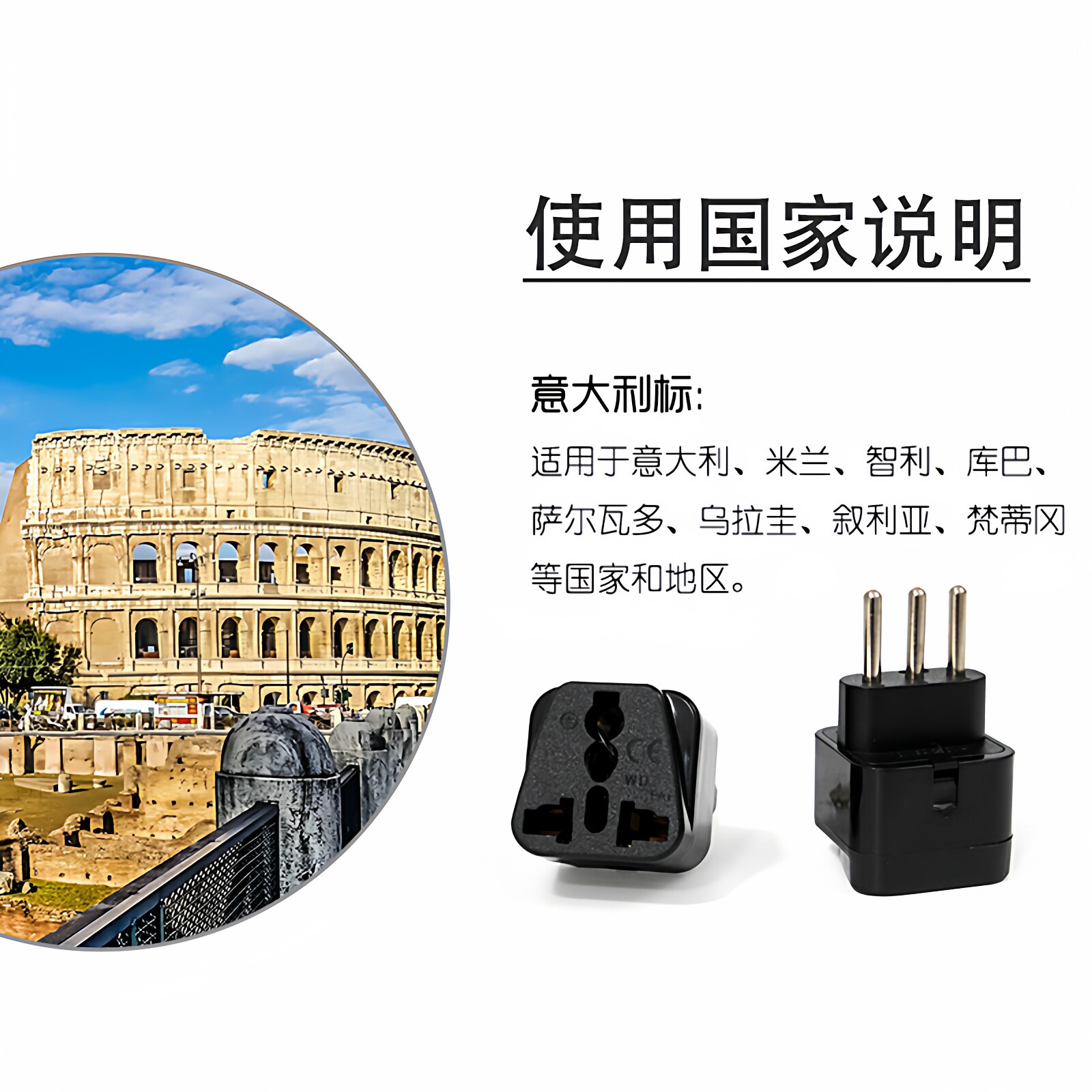 意大利转换插头(意标转接器)专为前往意大利、智利、叙利亚、古巴等使用意标插座的国家设计,适用于出国旅行或商务出行。该插头采用意大利标准(CEI 23-16/VII),两脚圆插设计,兼容当地电源插座,确保电器安全使用。产品通常由耐高温阻燃材料制成,内置安全保护门,防止误触触电。适用于手机、相机、笔记本等电子设备充电。轻便小巧,便于携带,是欧洲及南美部分国家旅行的必备配件。选购时需注意电压兼容性(意大利为230V/50Hz),建议搭配万能转换插头使用,以应对多国插座差异,保障全球出行用电无忧。