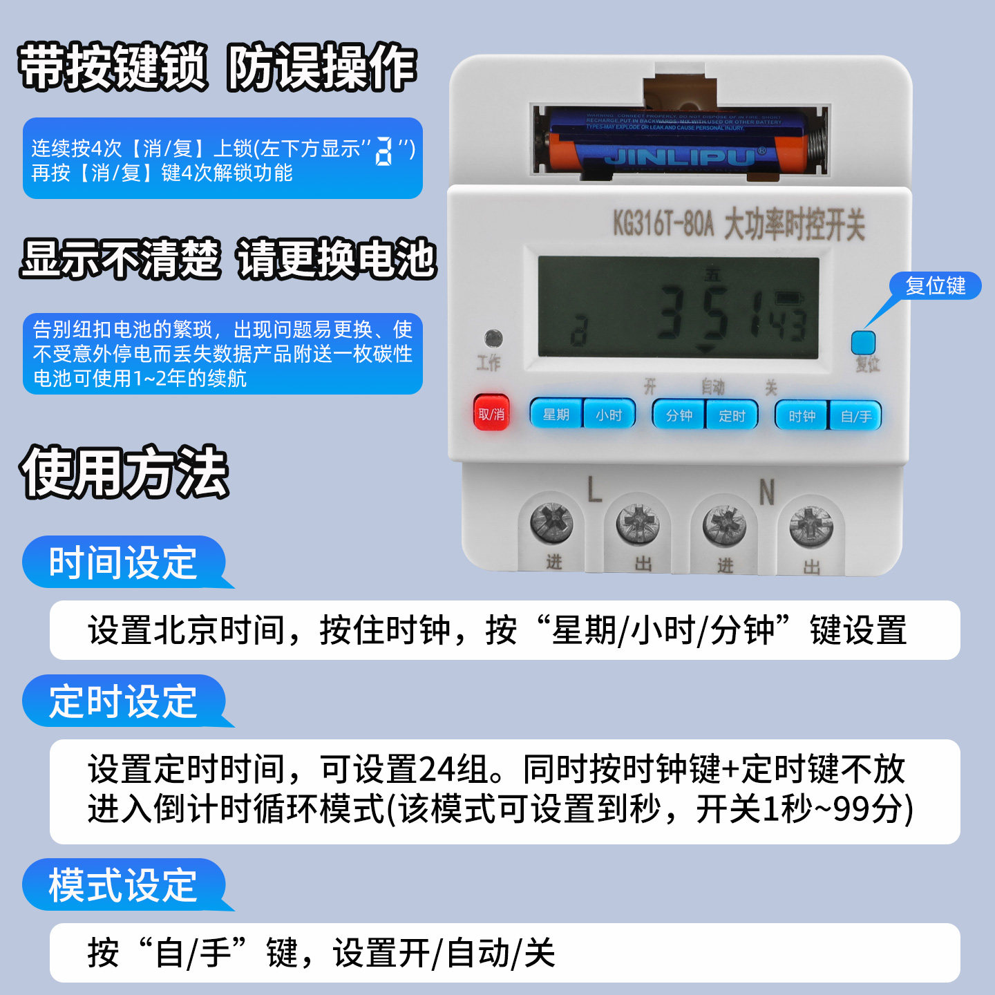 大功率时控开关定时器(220V)是一款集定时控制、漏电保护、智能计量与电源循环功能于一体的智能电气设备,专为充电桩、工业设备及大功率电器设计。支持220V电压,具备高精度定时启停功能,可设定多时段循环运行,实现自动化管理,节能高效。内置漏电保护模块,当检测到漏电流超标时自动切断电源,保障人身与设备安全。集成电能计量功能,实时监测用电量,便于成本核算与能耗管理。结构紧凑、安装便捷,适用于电动车充电桩、水泵、照明系统等场景,提升用电安全性与智能化水平,是现代智能电力管理的重要组件。