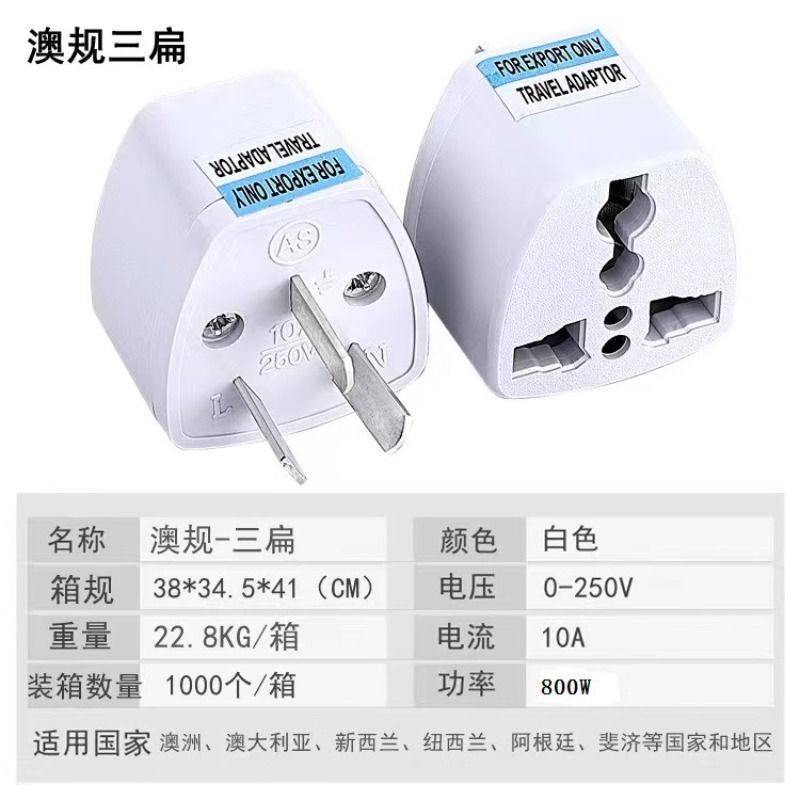 国标三叉插头澳标三插转换头,专为中国大陆、香港等地区使用的国标三扁脚插头设计,可轻松转换为适用于澳大利亚、新西兰等国的澳规三扁脚插座。该转换头采用优质阻燃材料制成,安全耐用,插脚精准对接,确保通电稳定、接触良好。体积小巧,便于携带,是赴澳新旅游、留学或商务出行的理想配件。使用时请确保电器功率在转换头额定范围内(通常支持250V/10A),并避免长时间高负荷使用。注意:此产品仅为插头转换,不具备电压转换功能,若电器非宽电压设计,请配合变压器使用,以保障设备安全。