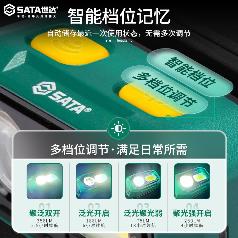 SATA世达感应头灯是一款专为户外作业与夜间活动设计的高性能头戴式照明工具。采用强光LED光源,亮度高、照射距离远,有效提升夜间视野清晰度。支持感应开关,挥手即可控制,操作便捷,解放双手。内置大容量锂电池,支持USB充电,续航能力强劲,满足长时间夜钓、检修、露营等需求。头戴式设计佩戴舒适,可调节头带适应不同头型,稳固不滑落。IPX4级防水设计,无惧风雨环境。无论是户外夜钓、工程维修还是夜间徒步,SATA世达感应头灯都是可靠、高效的照明伴侣,兼顾亮度、续航与实用性。
