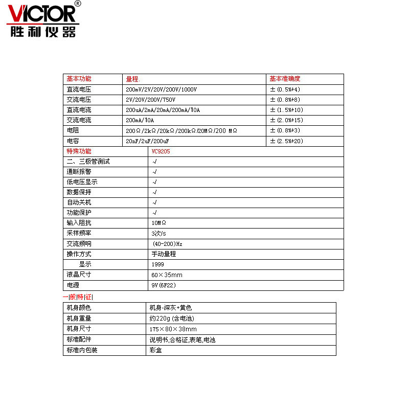 胜利万用表电工专用智能防烧数字高精度万能 VC9205C