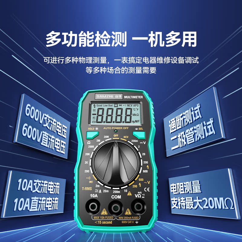 山泽数字高精度便携式智能全自动万用表,专为家用及电工维修设计,集多功能于一体。采用高精度ADC芯片,测量电压、电流、电阻、电容、频率、通断及二极管等参数精准可靠。全自动量程切换,操作简便,无需手动调节,降低误操作风险。配备高清LCD背光屏,数据清晰易读,支持数据保持与最大/最小值记录。内置智能芯片,具备过载保护与低电压提示,使用更安全。轻巧便携设计,适合家庭电器检修、电路排查及日常电子维护。无论是新手还是专业电工,都能轻松应对多种测量需求,是实用与智能兼具的得力工具。