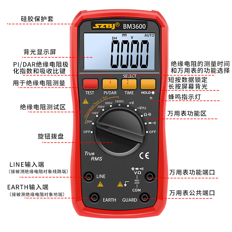 滨江数字绝缘电阻测试仪万用表BM3600是一款集绝缘电阻测试与万用表功能于一体的二合一精密仪器,适用于电力、通信、轨道交通等行业的设备维护与检测。该仪器具备高阻测量能力,支持最大5000V绝缘电阻测试,同时集成数字万用表的电压、电流、电阻、通断等常规测量功能,操作便捷。BM3600采用大容量充电锂电池,续航持久,支持快速充电,适合野外及无电源环境作业。配备大尺寸背光显示屏,数据读取清晰,具备数据存储与USB接口,便于后续分析。其高安全性设计符合国际电工标准,是专业电工和工程技术人员的理想检测工具。