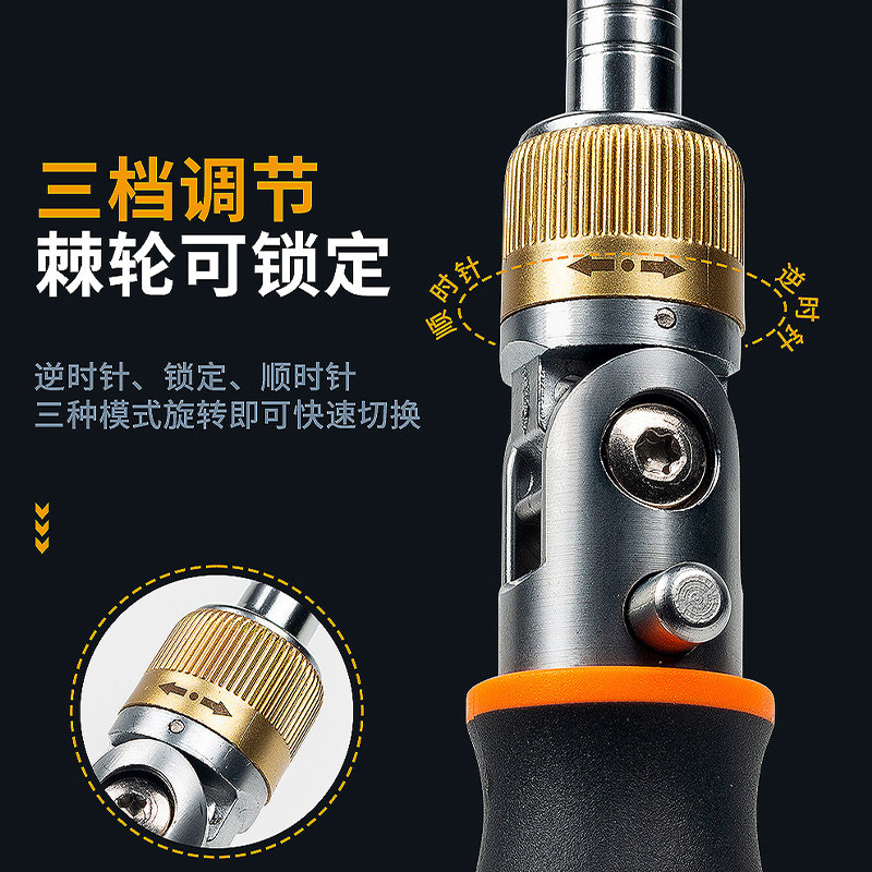 这款双向棘轮螺丝刀工具套装集多功能于一体,专为高效拆装设计。配备十字、一字、异型及梅花等多种批头,兼容常见螺丝类型,适用性强。采用高强度合金钢材质,耐用防锈,头部经强磁处理,轻松吸附螺丝,操作更便捷。独特的双向棘轮结构,支持顺逆时针快速切换,无需反复拔插,大幅提升工作效率。多角度设计让狭窄空间作业更灵活。套装内含多规格批头与延长杆,收纳便携,是家庭维修、电子设备拆装、家具组装的理想工具,兼顾专业性与实用性,满足多样化需求。