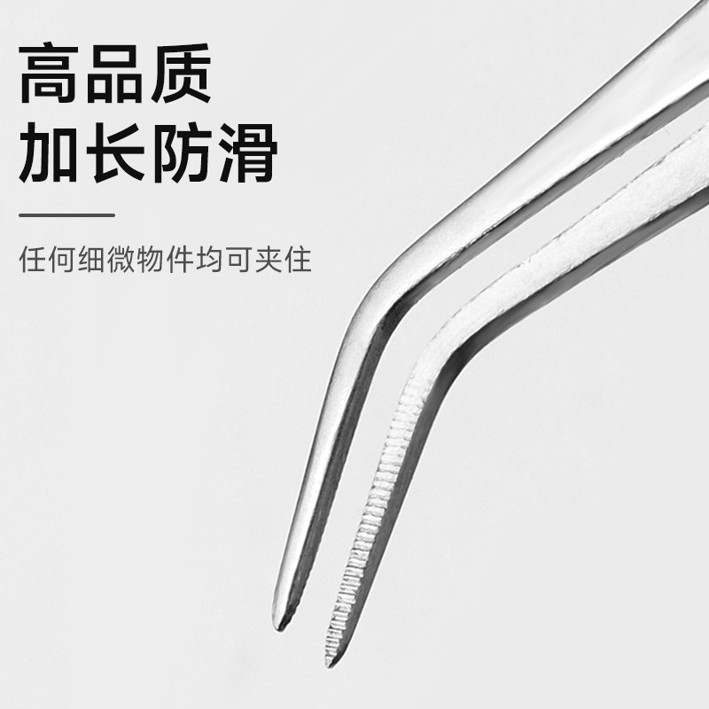 双弯尖头无齿纹镊子不锈钢加厚单弯有齿纹紧密检查夹子工具小零件