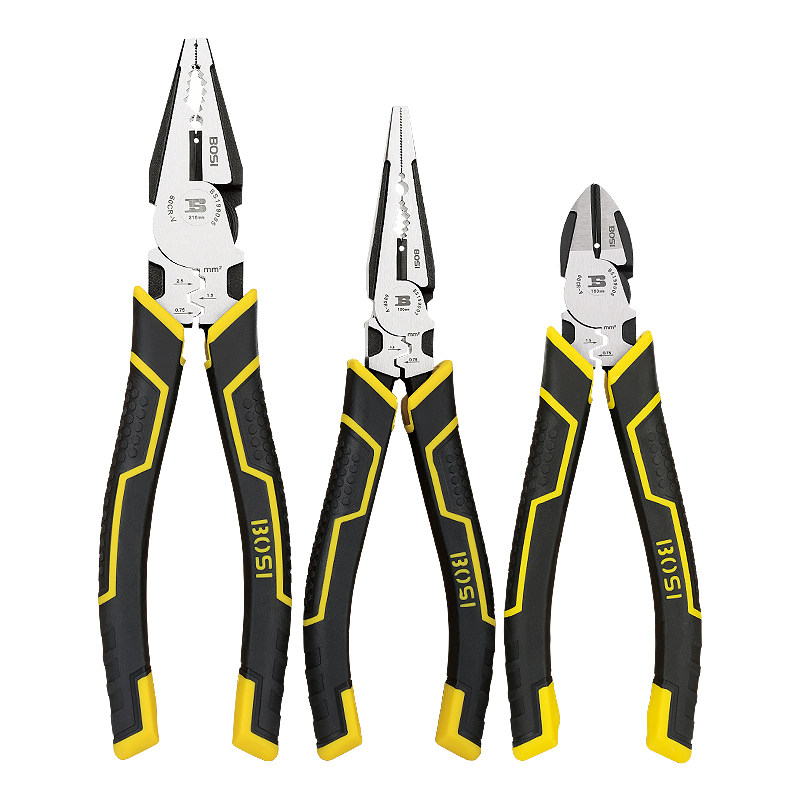 这款波斯多功能省力钳子套装包含6寸和7寸两种规格,涵盖老虎钳、钢丝钳、斜嘴钳、斜口钳及尖嘴钳等多种功能,一钳多用,满足家庭维修、电子装配、DIY手工等多种场景需求。采用优质高碳钢锻造,硬度高、耐磨损,手柄防滑设计,握感舒适,省力结构有效降低操作疲劳。钳口精密加工,剪切锋利,夹持稳固,可轻松处理钢丝、电线、细小零件等。结构紧凑,携带方便,是工具箱中的实用之选,兼顾专业性与性价比,适合工匠、维修人员及日常家用。