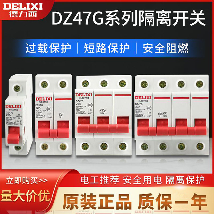 德力西隔离开关DZ47G系列是一款适用于家庭及小型商用场所的微型断路器,提供1P、2P、3P、4P多种极数选择,额定电流涵盖32A至100A,可灵活匹配单相或三相四线电路需求。产品具备可靠的隔离功能,能安全切断电源,便于设备维护与检修。采用优质阻燃材料,结构紧凑、安装便捷,符合国家安全标准,具备过载与短路保护功能。作为总闸使用时,可有效保障用电安全,提升配电系统稳定性。DZ47G系列以高性价比和稳定性能,广泛应用于住宅、商铺及轻工业配电系统中,是家庭配电箱中的理想选择。