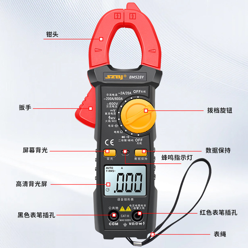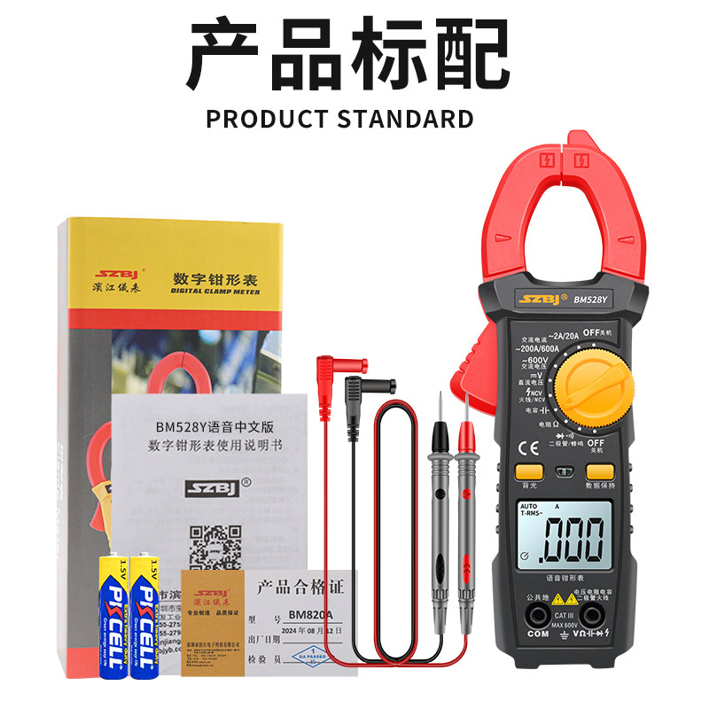 滨江BM528Y语音播报钳形表是一款高精度、多功能电工检测工具,专为600A大电流测量设计,具备零火线智能识别功能,可快速区分相线与零线,提升操作安全性。配备通断蜂鸣提示,测量导通状态时自动发声报警,便于在嘈杂环境中使用。高精度传感器确保数据准确可靠,支持交流电流、电压、电阻等多种参数测量。独特的语音播报功能,实时语音输出测量结果,解放双眼,提高工作效率。钳口设计宽大,适合测量大截面导线。广泛应用于电力检修、工业控制及家庭用电检测,是专业电工的理想选择。