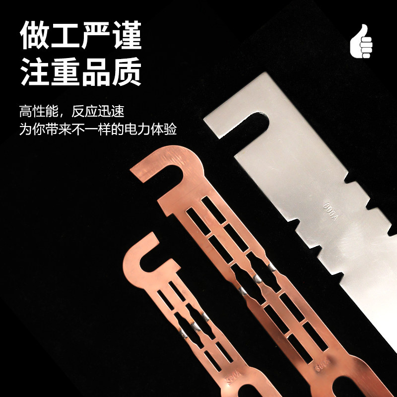 户外低压刀熔片隔离开关广东型熔断片采用优质紫铜材质,导电性能优异、耐腐蚀性强,广泛应用于1000V以下低压配电系统。其额定电流覆盖20A至1000A,适用于频繁操作的户外环境。熔断片设计为羊角铝片结构,便于安装与更换,兼具良好的散热性能与机械强度。产品具备可靠的短路保护与隔离功能,符合国家标准,广泛应用于变电站、工矿企业及农村电网等场景。紫铜保险片熔断精准,响应迅速,有效保护线路与设备安全。整体结构紧凑、操作便捷,是户外低压配电系统中安全可靠的保护元件。