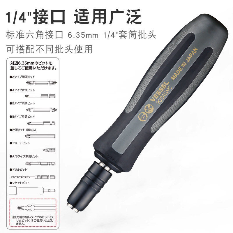 日本威威(VESSEL)进口1/4快速锁紧套筒螺丝刀起子电动批头手柄6.3mm 900ALW,采用高品质合金钢制造,具备出色的耐用性与抗扭强度。其6.3mm(1/4英寸)标准六角夹头,兼容多种批头与套筒,广泛应用于家电、汽修、设备组装等领域。独特的快速锁紧设计,实现批头秒换,操作便捷高效。人体工学手柄设计,握感舒适,防滑耐磨,长时间使用不易疲劳。适用于手电钻、电动螺丝刀等工具,是专业技工与DIY爱好者的理想选择。日本精工制造,品质可靠,性能稳定,助力精准作业。