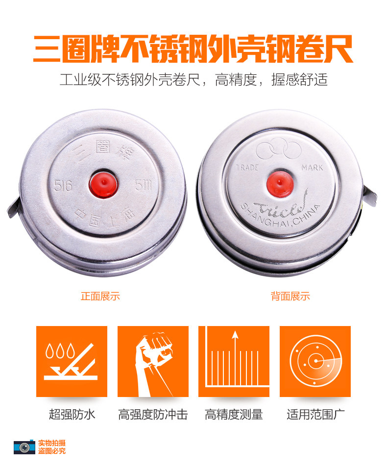 天猫上海三圈 不锈钢外壳小钢卷尺1米2米3m5米盒尺木工高防水防锈精准