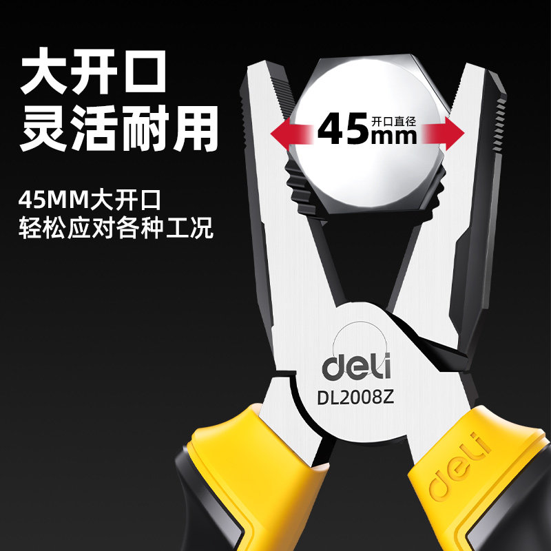 得力老虎钳工业级尖嘴钳,集斜口钳、钢丝钳、尖嘴钳等多功能于一体,专为电工及家庭维修设计。采用高硬度合金钢材质,经热处理工艺打造,具备出色的耐磨性与抗腐蚀性,确保长久耐用。钳口精密咬合,剪切力强,可轻松处理钢丝、电线、金属片等硬质材料。人体工学防滑手柄设计,握感舒适,操作省力,有效降低长时间使用疲劳。无论是家庭日常维修、电路安装,还是工业作业,都能高效应对。得力品牌品质保障,安全可靠,是工具箱中不可或缺的多功能钳具,满足您对精准、高效、耐用的全方位需求。