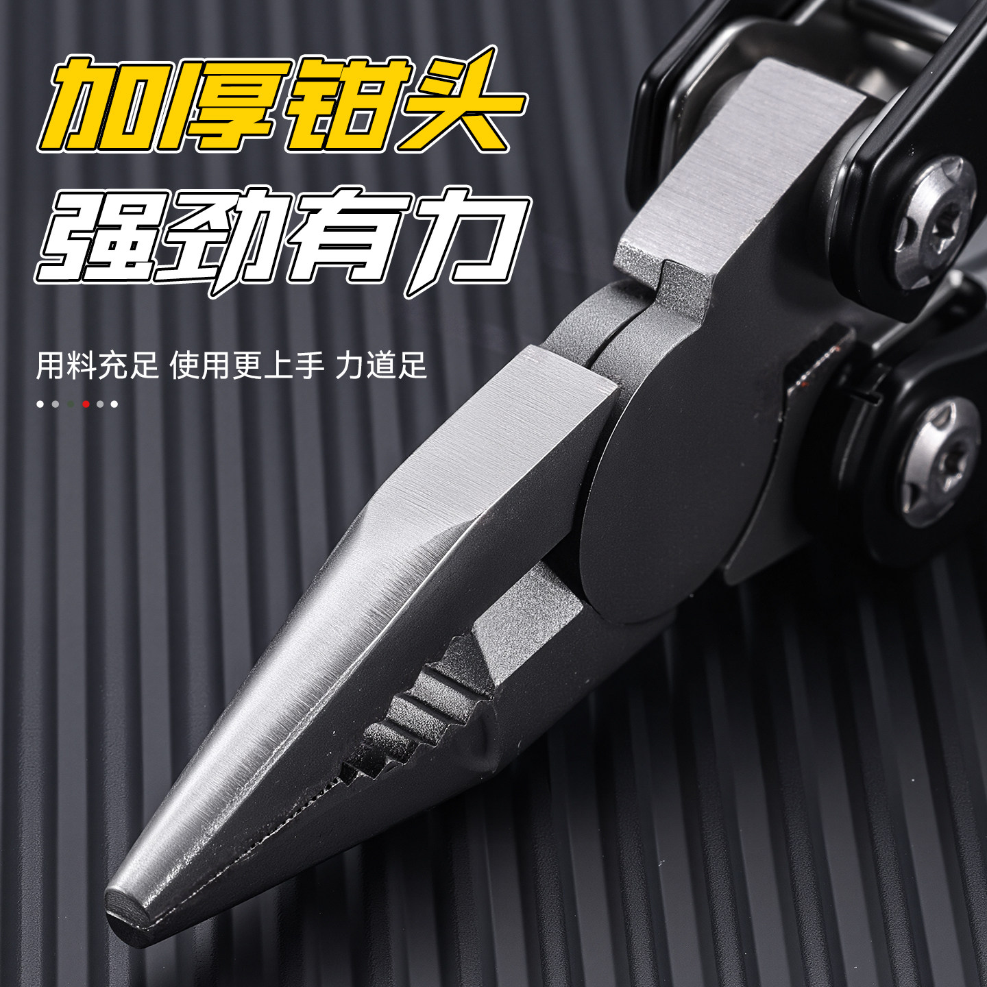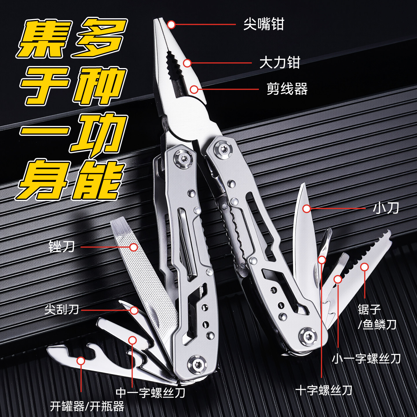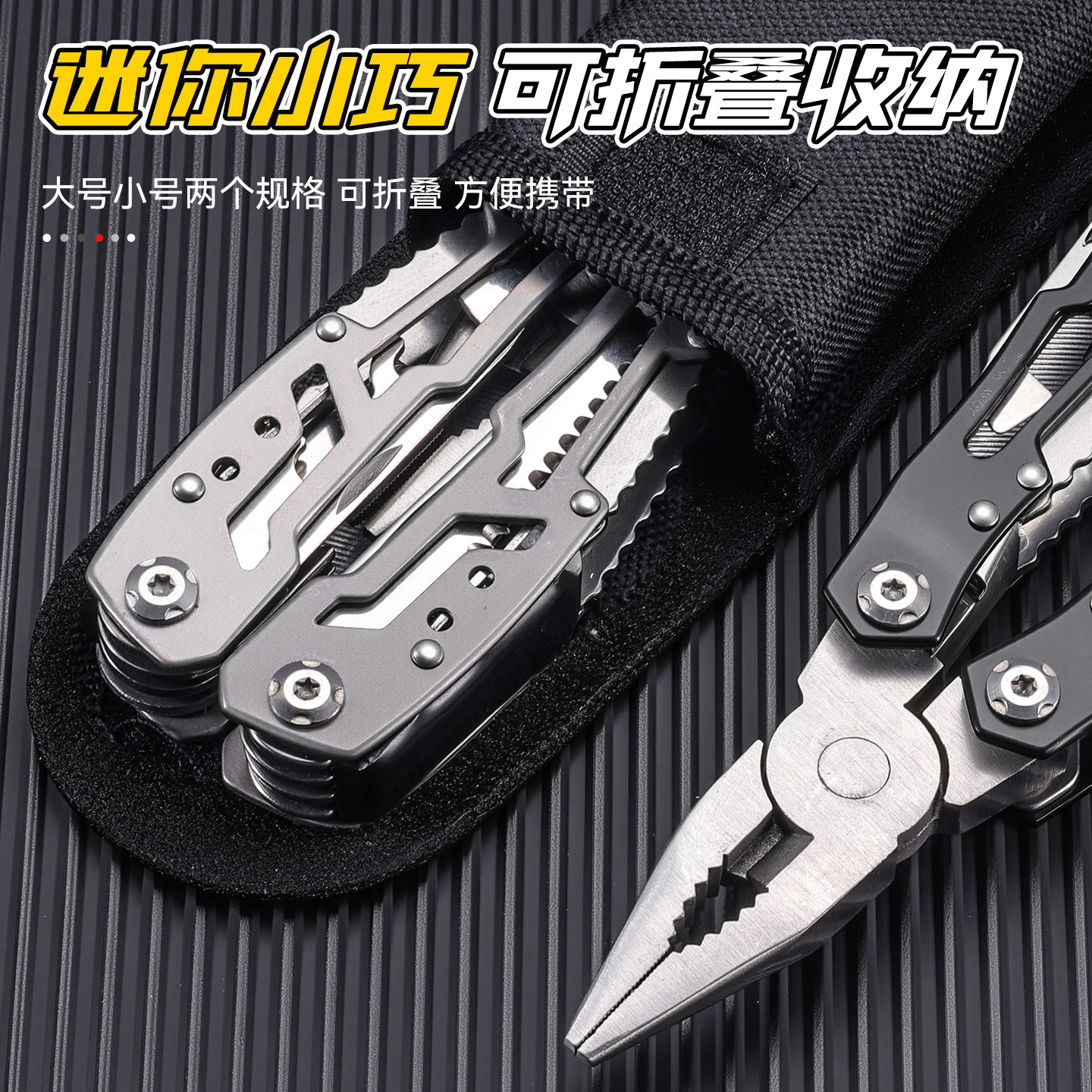 这款多功能折叠钳集成了老虎钳、小刀、螺丝刀、开瓶器等多种实用工具,采用高强度不锈钢材质,坚固耐用且防锈。精巧的折叠设计使其体积小巧,可轻松收纳于钥匙扣上,随身携带极为方便。无论是户外露营、徒步旅行,还是日常应急维修,都能轻松应对各种场景需求。工具切换便捷,操作简单,满足切割、夹持、拧螺丝、开瓶等多样化用途。集实用性与便携性于一体,是户外爱好者和都市通勤族的理想随身工具,让生活更便捷、安全。