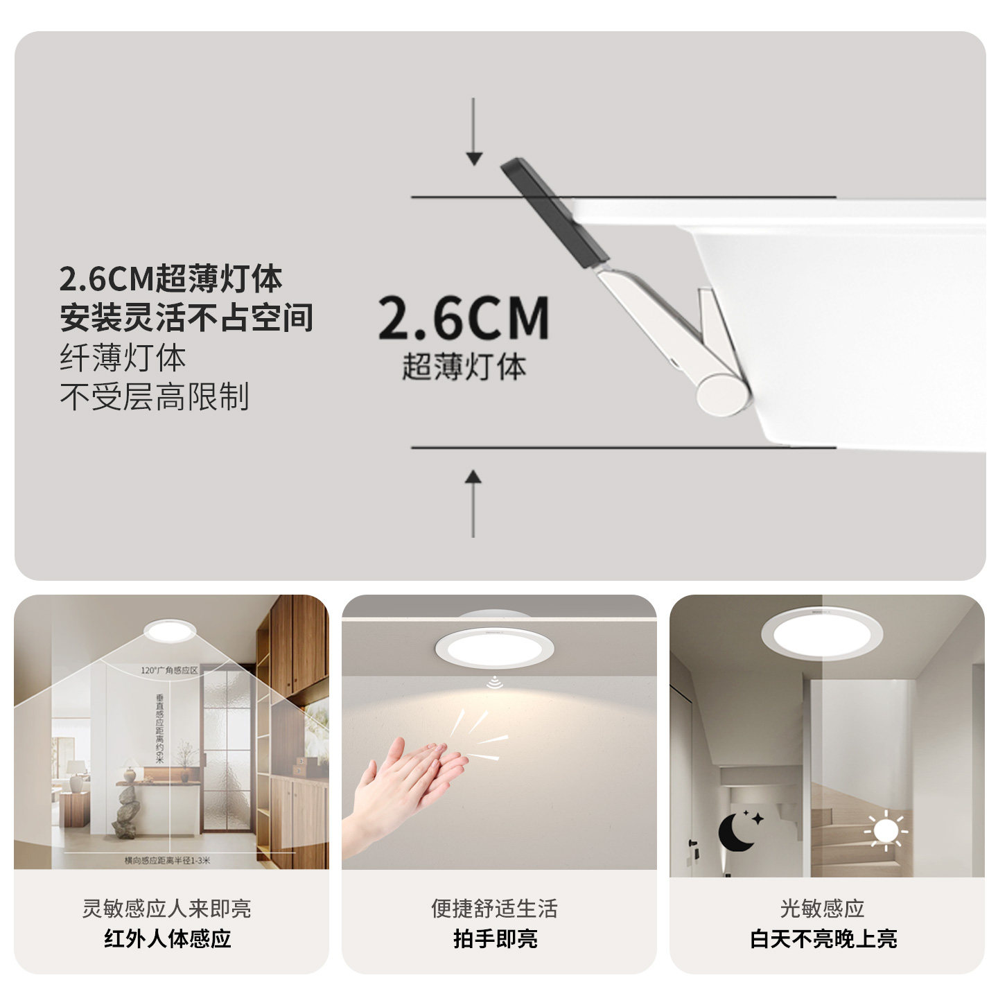 这款超薄红外人体雷达感应筒灯是一款专为家用过道、玄关等空间设计的智能照明产品。采用6寸开孔嵌入式安装,适配标准天花吊顶,外观简约美观。内置高精度红外雷达传感器,可智能感知人体移动,实现人来灯亮、人走灯灭,无需手动开关,节能又便捷。结合声控功能,在安静环境下轻拍手或发出声响即可唤醒灯光,适应多种使用场景。搭载高亮LED光源,光线柔和均匀,显色指数高,护眼舒适。超薄机身设计节省空间,安装简便,适用于走廊、楼梯、卫生间等区域,是提升家居智能化与舒适度的理想选择。