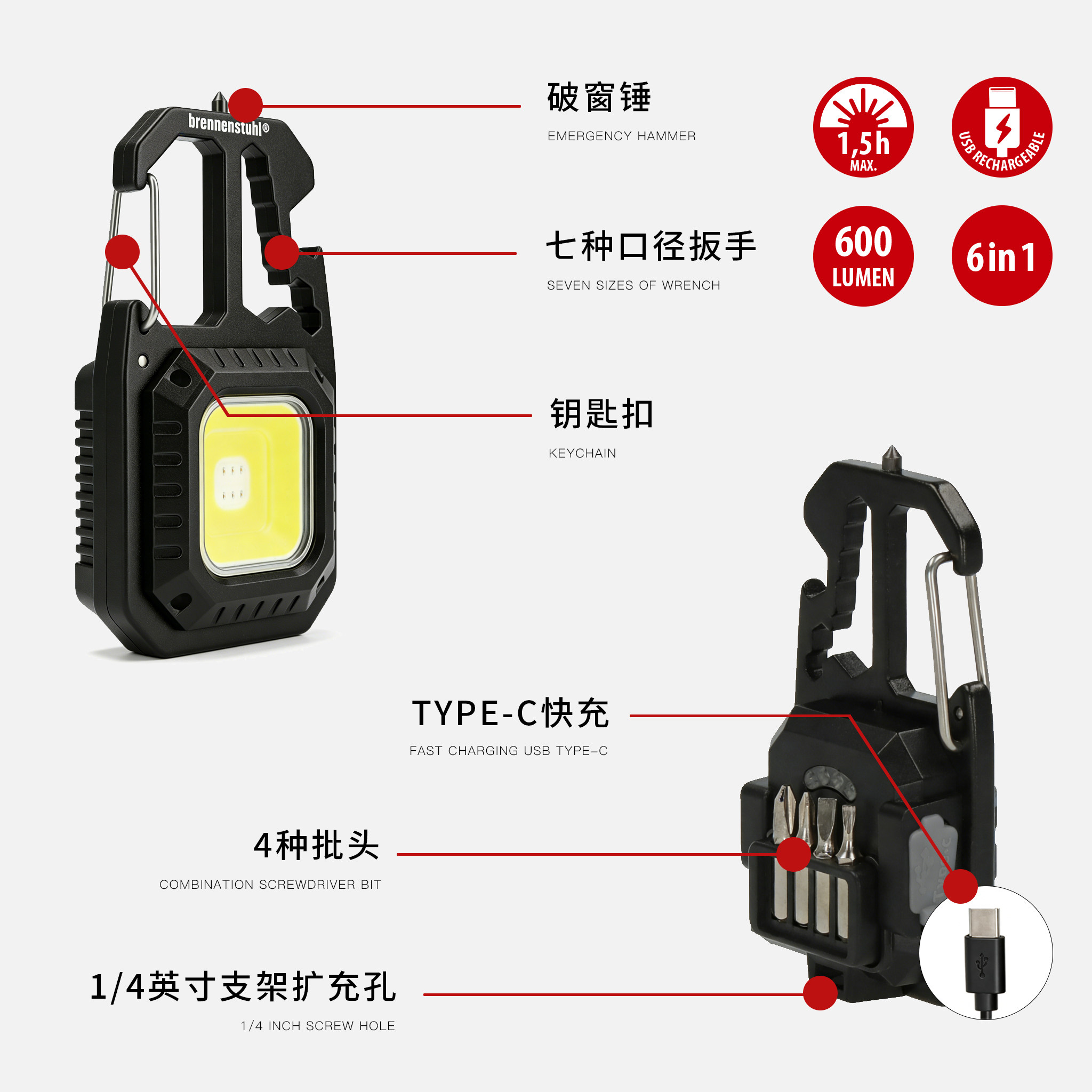 百能斯图户外多功能钥匙扣灯手电筒,集便携性、实用性与强光照明于一体,专为户外爱好者及应急场景设计。采用高亮LED灯珠,提供强光照明,有效照射距离远,满足夜间徒步、露营、检修等需求。小巧轻便,可轻松挂于钥匙圈或背包,随身携带不占空间。内置可充电锂电池,支持USB快充,续航持久,环保节能。具备防水防震设计,适应多种恶劣环境。除照明外,部分型号还集成破窗器、割刀等应急功能,是户外探险、日常通勤及家庭应急的理想工具。百能斯图,照亮前路,守护安全。