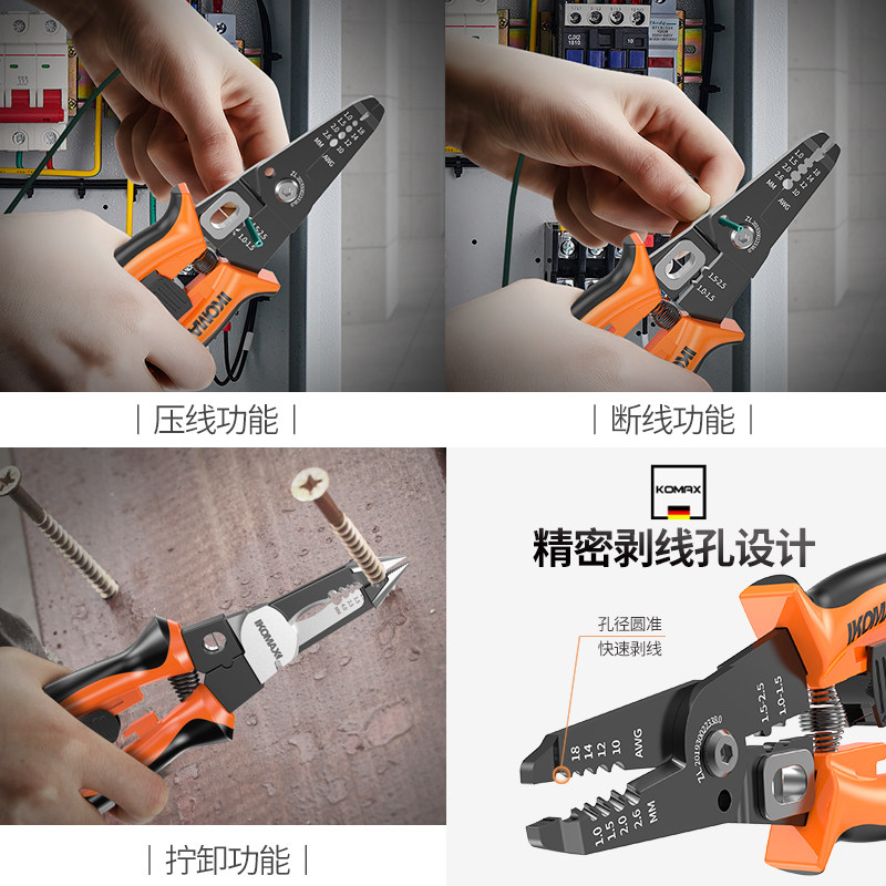 剥线钳是一款专为电工设计的多功能万能工具,集剪线、剥线、压接于一体,适用于各类电线、电缆的精细操作。其精密刀口可精准剥离不同规格的电线外皮,不损伤内部导体,提升作业效率与安全性。采用高硬度合金钢材质,经久耐用,手柄符合人体工学设计,握感舒适,防滑省力。部分型号还具备自动调节剥线口径功能,适用24-10AWG多种线径。无论是家庭电路维修、电器安装,还是工业布线,剥线钳都是不可或缺的专业工具,被誉为“剥电线皮神器”,是电工师傅和DIY爱好者的理想选择。