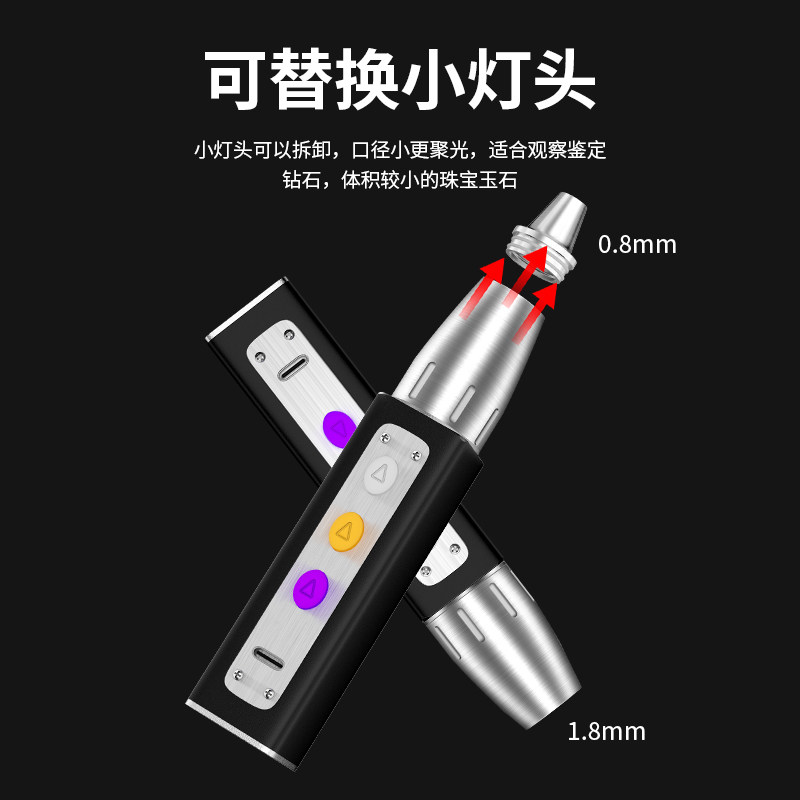 玉石鉴定专用手电强光灯是一款专为珠宝、翡翠、玉石等贵重物品鉴别而设计的多功能工具。配备365nm高强度紫光灯,可有效激发翡翠、宝石中的荧光反应,帮助识别天然与处理品,同时具备白光强光模式,便于观察玉石内部结构与瑕疵。此外,该灯兼具验钞功能,适用于烟酒、证件、货币的真伪鉴别。采用优质LED光源,亮度高、能耗低、寿命长,便携设计适合收藏爱好者、珠宝商及鉴定师随身携带。无论是日常鉴赏还是专业检测,这款多功能电筒都能提供精准、可靠的辅助,是玉石珠宝鉴定的得力助手。