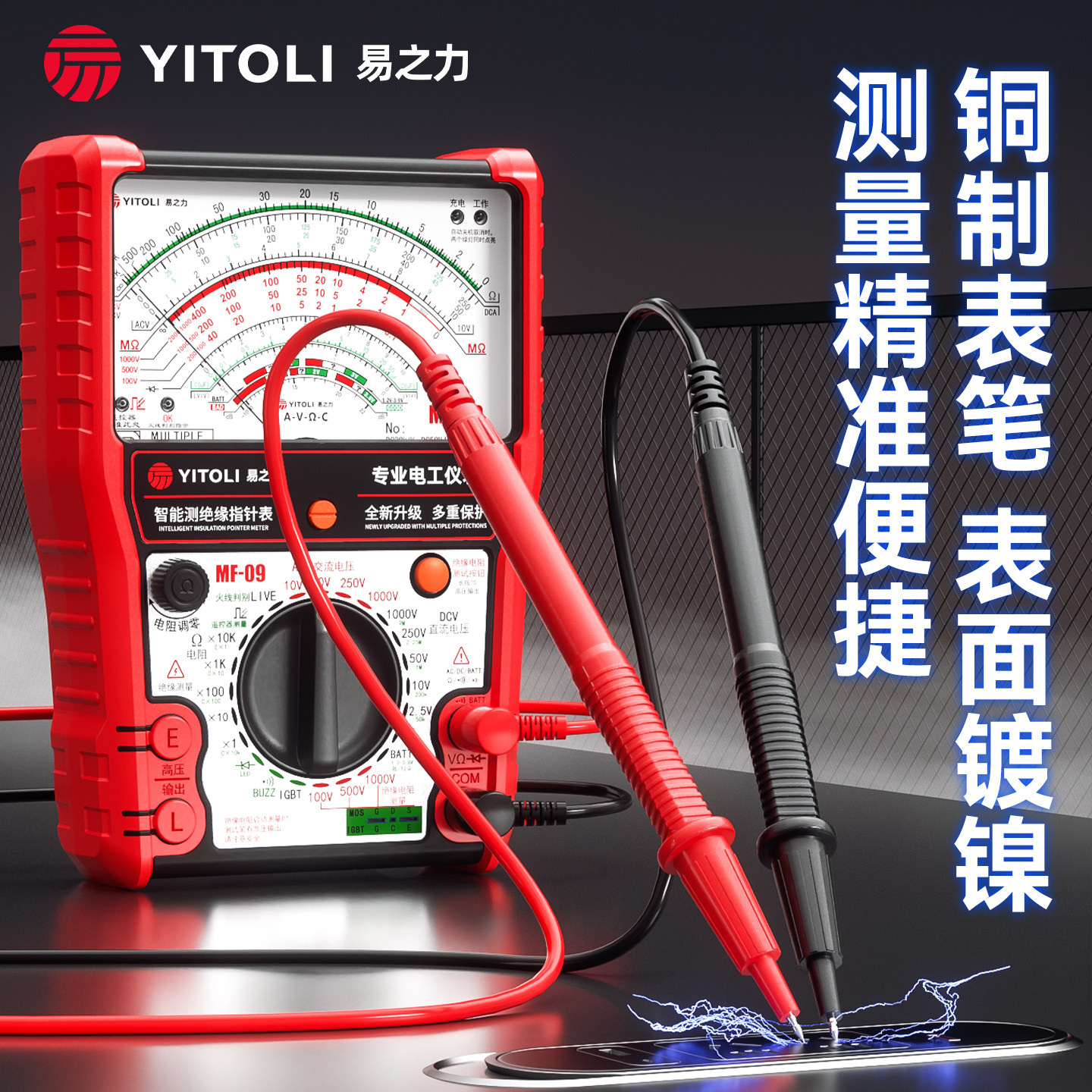 易之力MF09万用表是一款集指针式万用表与兆欧表(摇表)功能于一体的高精度电工专用仪表。采用经典指针显示,读数直观稳定,抗干扰能力强,适用于复杂电磁环境。具备电压、电流、电阻等多功能测量,同时集成兆欧测试功能,可快速检测电气设备绝缘性能,广泛应用于电机、电缆、配电柜等维护检测。内置防烧保护电路,有效防止误操作损坏仪表,安全可靠。结构坚固,操作简便,是电工日常检修、故障排查的理想工具。MF09兼具传统指针表的可靠性与现代防护设计,满足专业电工对精度与耐用性的双重需求。