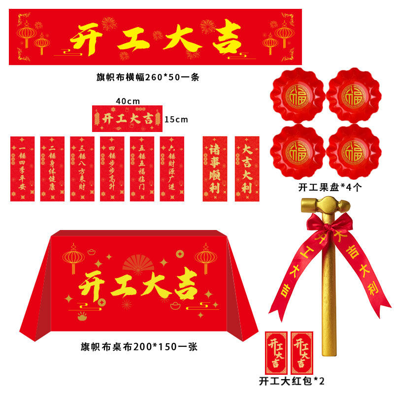 装修开工大吉仪式用品全套,专为新房动工营造喜庆祥瑞氛围而设计。包含精致小金锤、红绸桌布、吉祥条幅、开工横幅、喜庆旗帜及专用布质新房开工锤等全套道具。小金锤寓意“一锤定音”,象征工程顺利、家宅平安;红色元素代表红红火火、驱邪纳福。条幅与横幅印有“开工大吉”“黄道吉日”等吉祥语,增强仪式感。旗帜飘扬,彰显隆重氛围。所有用品材质环保、印刷清晰,适用于家庭、别墅、工装等各类装修场景,既传承传统习俗,又增添现代美感,是开启美好家居生活的重要仪式象征。