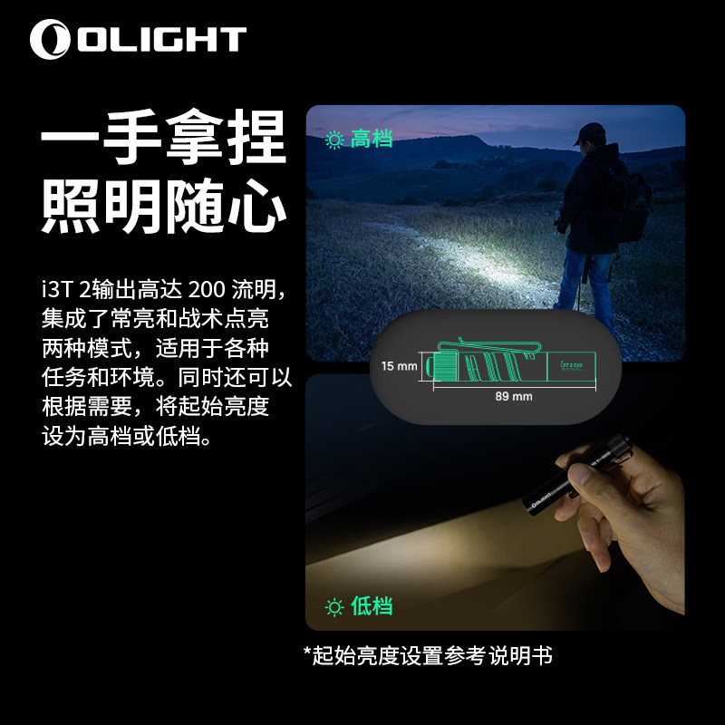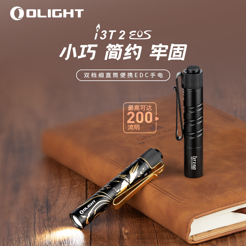 OLIGHT傲雷i3T2是一款精致实用的EDC便携手电筒,采用AAA电池供电,轻巧细长的直筒设计,便于随身携带。搭载高效LED光源,最高亮度可达200流明,提供清晰明亮的照明效果。尾部按键设计,操作便捷,支持双档切换——低亮3流明适合近距离阅读或夜间行走,高亮200流明满足户外搜索或应急照明需求。铝合金机身坚固耐用,表面经阳极氧化处理,具备良好的抗腐蚀与耐磨性能。IPX8级防水设计,无惧恶劣天气。i3T2兼顾性能与便携性,是日常通勤、户外探险及家庭备用的理想照明工具,展现OLIGHT在小型照明设备领域的精湛工艺与实用理念。