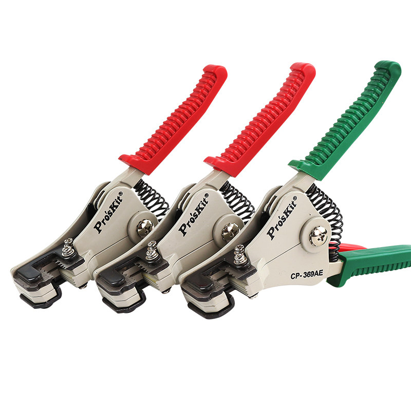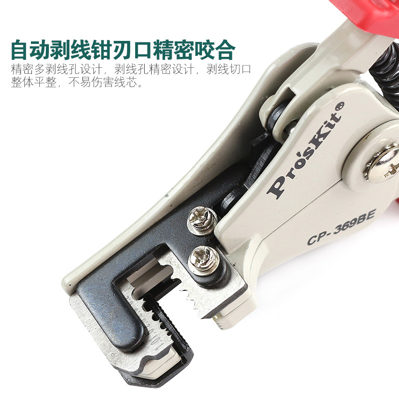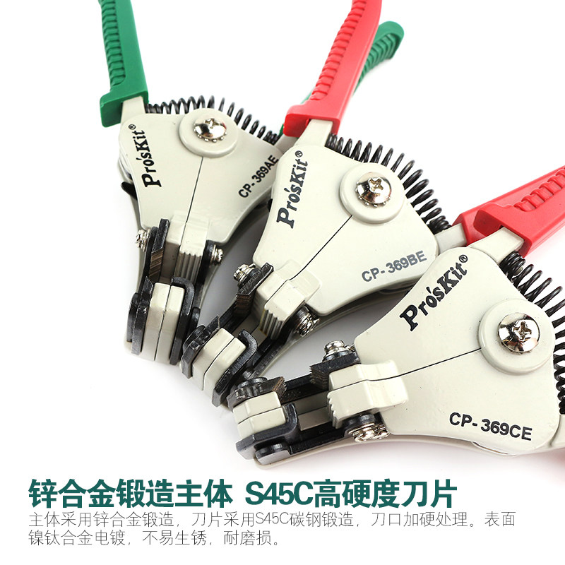 台湾宝工(Pro'sKit)CP-369AE/BE/CE自动鹰嘴剥线钳是一款多功能精密剥线工具,专为电工、电子爱好者及维修人员设计。采用高品质合金钢材质,刀刃锋利耐用,支持多种线径(AWG 10-24)的电线快速剥皮,操作省力高效。其独特的自动调节设计可精准控制剥皮深度,避免损伤导体。鹰嘴式钳头便于在狭小空间作业,集成压接与剪切功能,一钳多用。人体工学防滑手柄提升握持舒适度,适合长时间使用。CP-369系列分AE/BE/CE型号,适配不同需求,是专业级剥线工具的理想选择,广泛应用于家电维修、通信布线及自动化控制领域。