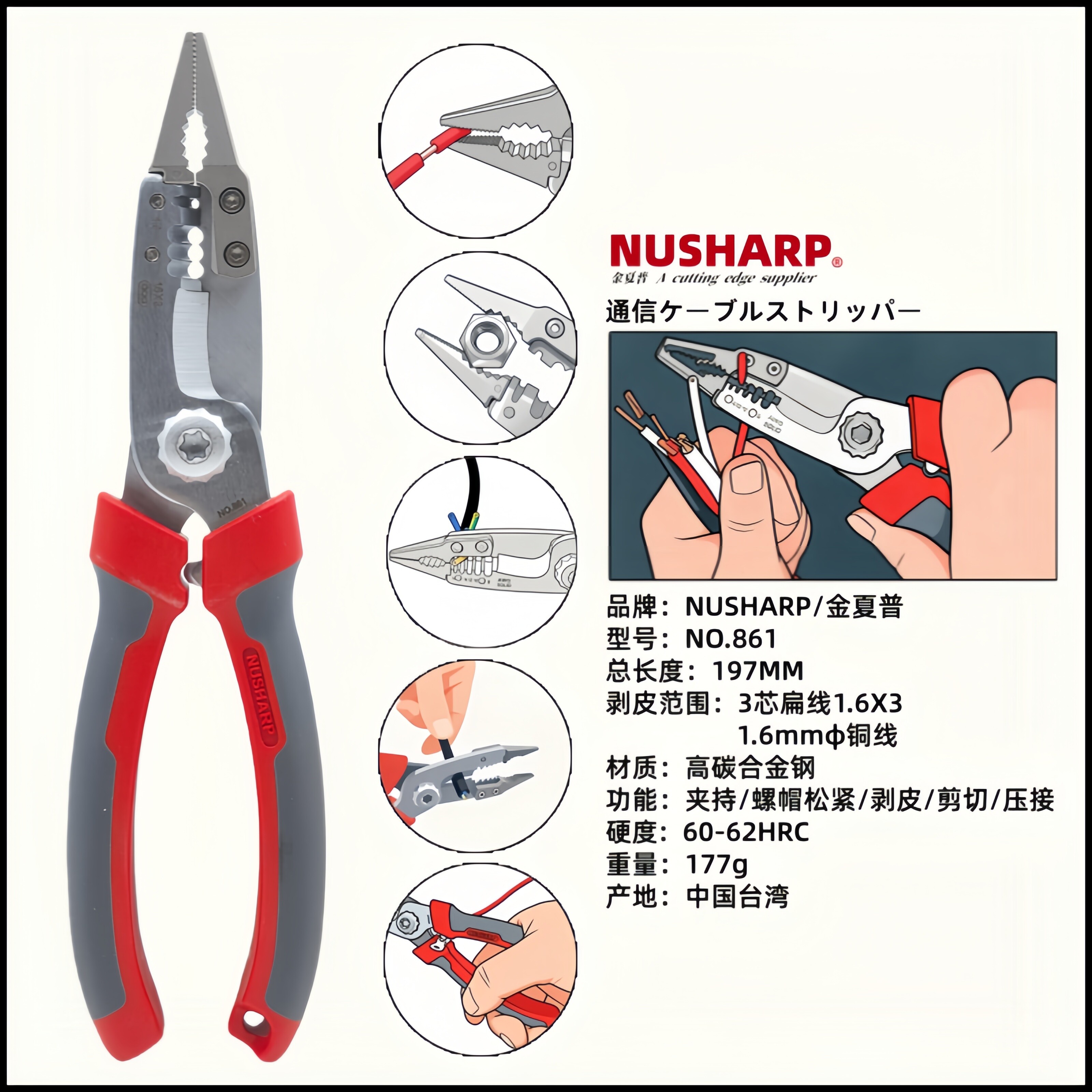日本NUSHARP金夏普进口尖嘴多功能电工剥线钳,专为精密电工操作设计,适用于3芯扁线、单股电线等多种线材的精准剥皮。其采用高品质合金钢材质,刀刃锋利耐用,确保切口平整不伤线芯。独特的尖嘴设计便于在狭小空间操作,提升作业效率。钳身符合人体工学,握感舒适,防滑手柄保障安全使用。具备多档位调节功能,可适配不同线径(0.5–6mm²),一钳多用,广泛应用于家电维修、配电安装及电子设备维护等领域。NUSHARP凭借日本精湛工艺与严格品控,成为专业电工信赖之选,兼顾精准、高效与耐用性。