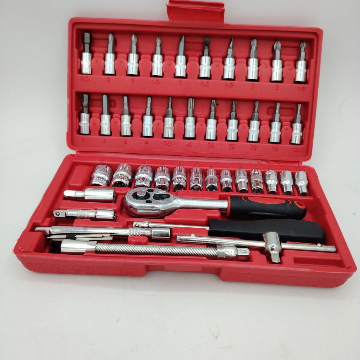 本厂专业生产的46件套汽修组合工具套装,专为汽车维修、机械装配及日常维护设计。套装包含多种规格套筒、棘轮扳手、延长杆、万向接头及精密批头,覆盖常见螺丝与螺母尺寸,适配性强。采用优质铬钒钢材质,经热处理工艺,硬度高、耐磨抗腐蚀,使用寿命长。棘轮扳手设计符合人体工学,操作省力顺畅;工具箱为高强度工程塑料制成,分层收纳,便于携带与整理。适用于轿车、摩托车、家电维修等多种场景,是汽修技师、DIY爱好者及家庭用户的理想选择。厂家直供,品质保障,支持定制与批量采购。