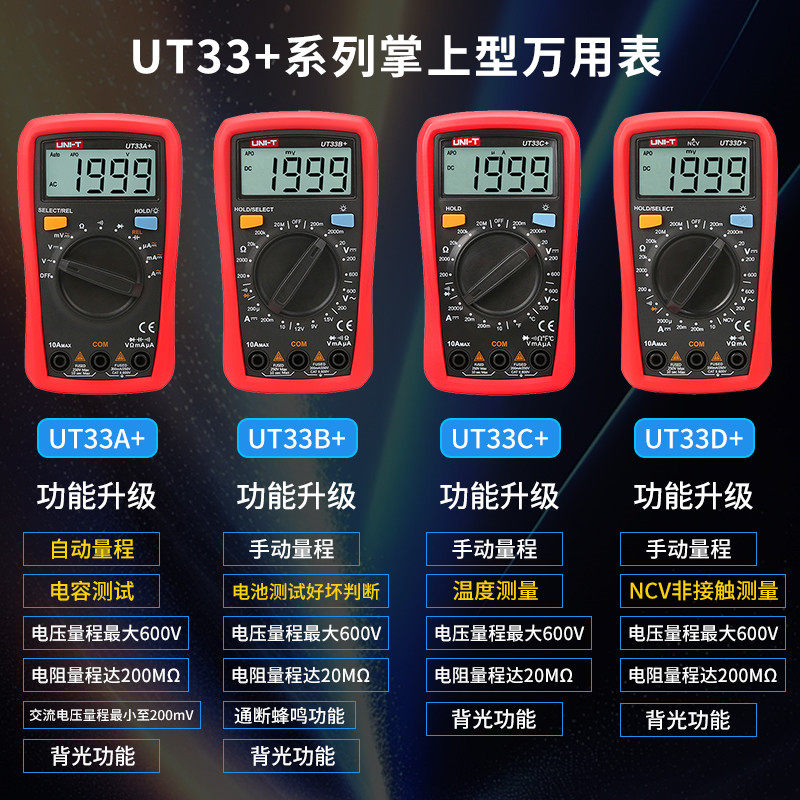 淘宝UNI-T优利德小型数字万用表UT33A+/B+/C+数显背光防烧电工万能表