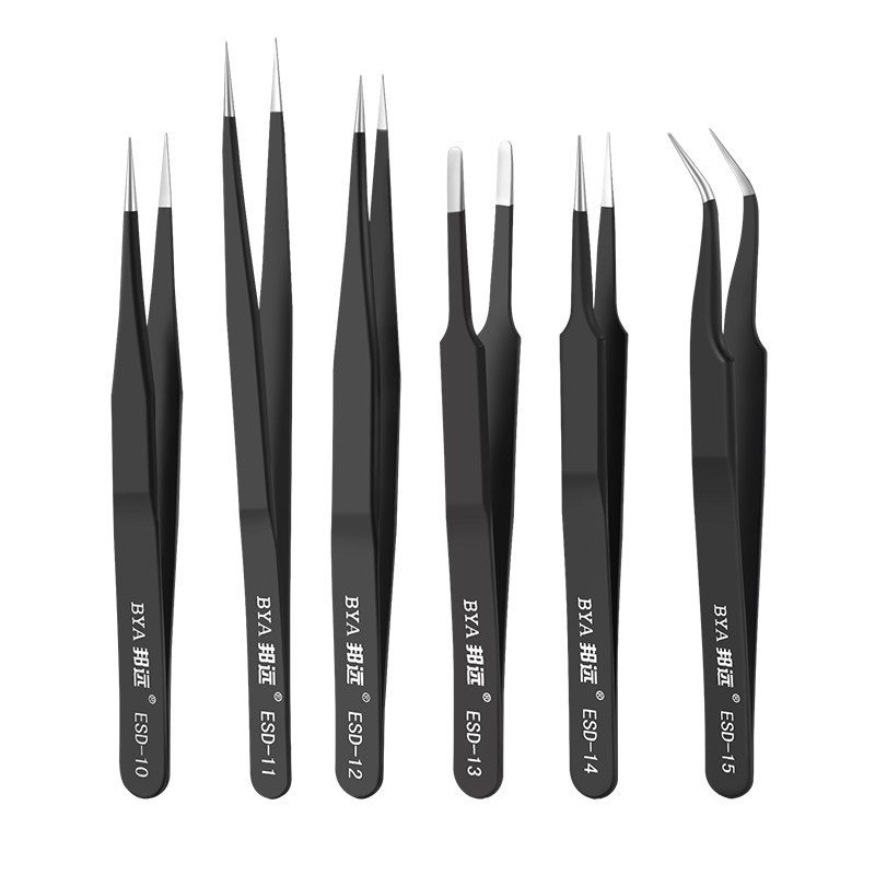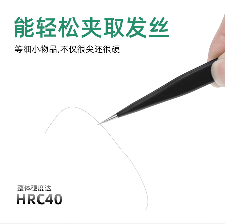 不锈钢精密镊子ESD黑色防静电夹子,专为精密电子维修设计。采用高品质不锈钢材质,经加硬处理,具备优异的耐磨性与抗腐蚀性,确保长久使用不变形。表面经特殊ESD防静电处理,有效防止静电损伤敏感元器件,适用于半导体、手机、手表等精密作业。提供弯尖、直尖、扁头及超尖等多种规格,满足不同精细操作需求。防磁设计避免干扰精密设备,操作更安心。黑色哑光表面减少反光,提升操作精准度。是电子工程师、维修技师及DIY爱好者的理想工具,兼具功能性、耐用性与人体工学设计,助力高效完成精密作业。