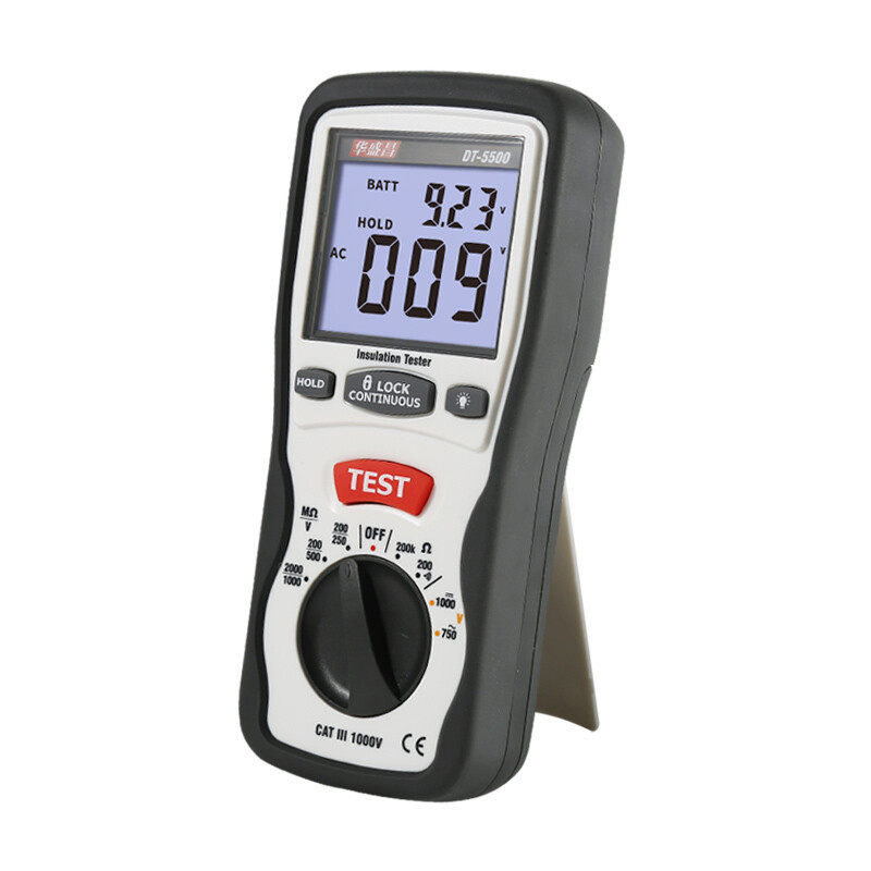 CEM华盛昌DT-5500/5505/6605系列专业数字绝缘电阻测试仪(兆欧表)是一款高精度、多功能的电气安全检测设备,适用于电力系统、通信、轨道交通及工业设备的绝缘性能检测。该系列产品具备多种测试电压(如500V、1000V、2500V等),可测量高达10GΩ以上的绝缘电阻,分辨率高、响应迅速。采用大屏背光液晶显示,支持数据保持、自动放电及实时电压监测功能,确保操作安全。具备IP67防护等级,结构坚固,适应恶劣环境。内置大容量锂电池,续航持久,并支持USB数据导出,便于记录与分析。广泛应用于电力维护、设备检修及质检领域,是专业电工和工程师的可靠工具。