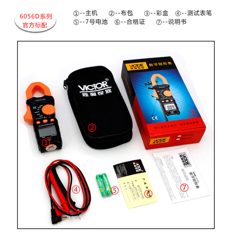 胜利钳形表VC6056A+C+B是一款高精度多功能数字钳型万用表,适用于交直流电流、电压、电阻、频率、电容及通断测试等多种测量需求。其非接触式钳头设计,可安全便捷地测量导线电流,尤其适合在不断电情况下检测线路电流。具备真有效值(True RMS)功能,确保在非线性负载下仍能获得精准读数。配备高清背光LCD显示屏,数据读取清晰直观,支持数据保持与自动关机功能,提升使用效率与电池续航。结构紧凑、操作简便,广泛应用于电力、通信、 HVAC及工业维护等领域,是专业电工和技术人员的理想测量工具。