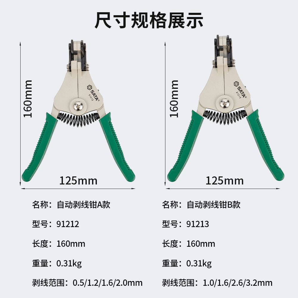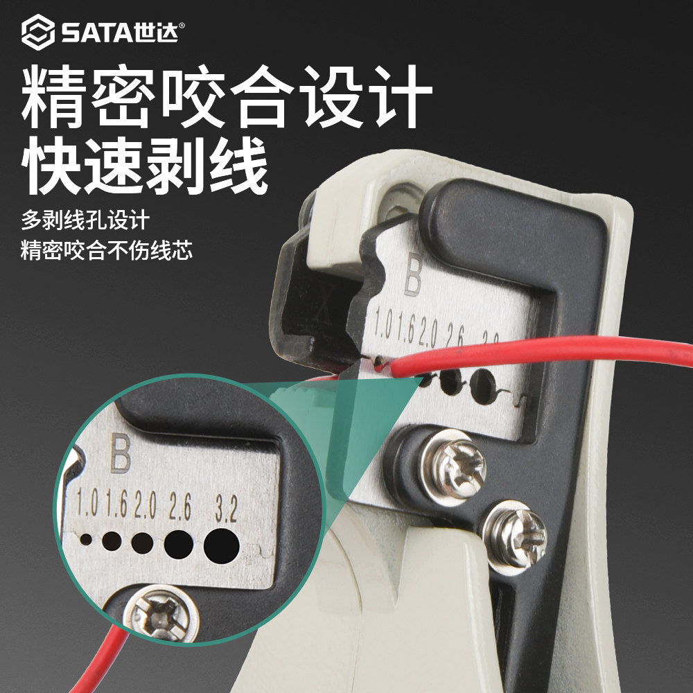SATA世达自动剥线钳(型号91212/91213)是一款专为电工设计的专业剥线工具,适用于多种规格的铜电缆。采用高品质合金钢材质,刀刃锋利耐用,可精准剥离电线绝缘层而不损伤导体。其自动调节功能可根据线径智能适配,操作简便高效,大幅提升工作效率。手柄符合人体工学设计,握感舒适,防滑耐磨,适合长时间作业。产品具备多档位调节,支持0.5mm²至6mm²导线,广泛应用于家庭布线、电气设备安装及维修等场景。SATA世达品牌保障,品质可靠,是电工师傅值得信赖的剥线神器。