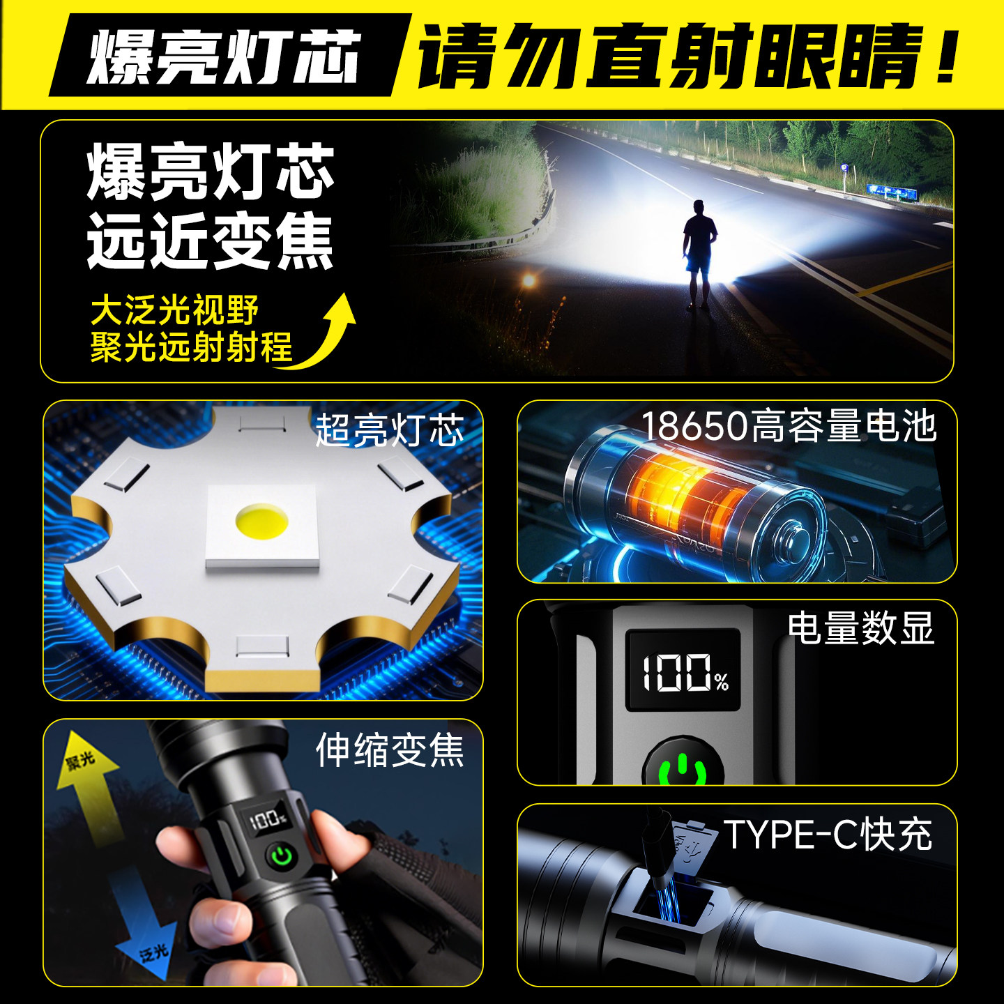 多功能高亮强光手电筒充电便携小型露营户外灯学生宿舍护眼看书