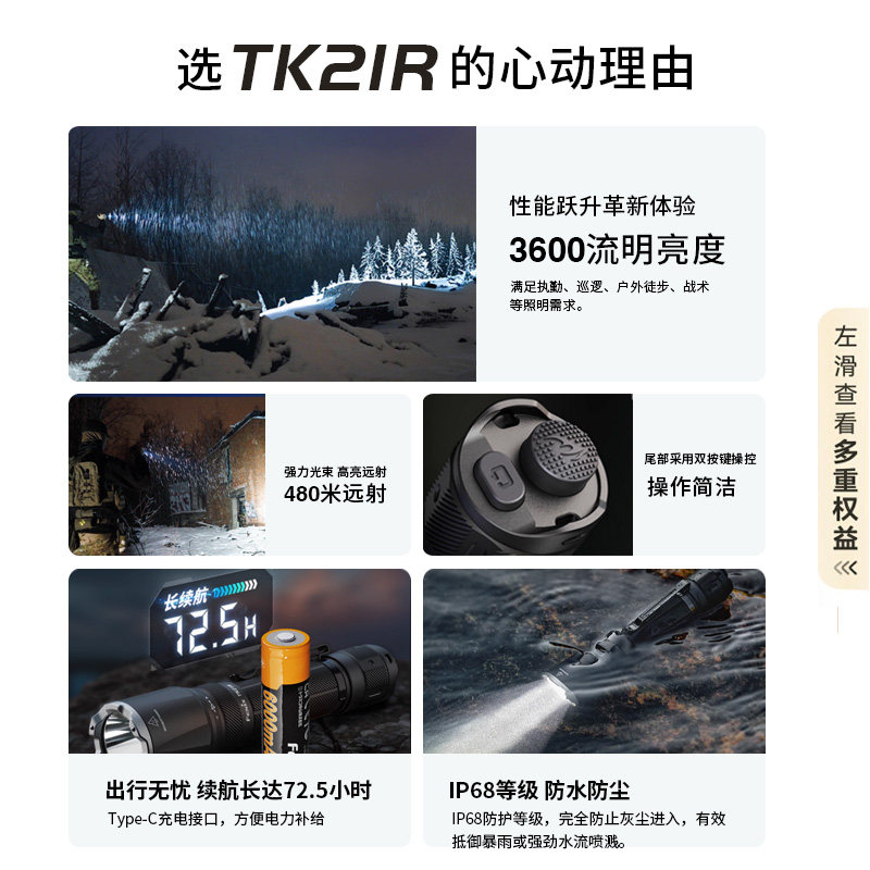 天猫Fenix菲尼克斯TK21R新款强光可充电超长续航大容量户外便携手电筒