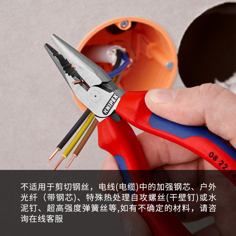 KNIPEX德国凯尼派克082*145是一款高品质多功能省力钢丝钳,融合老虎钳与尖嘴钳功能于一体,适用于电工、机械维修及日常作业。采用优质铬钒钢锻造,硬度高、耐用性强,表面经特殊防锈处理,使用寿命长。独特的杠杆原理设计显著提升剪切力,轻松切断钢丝、软金属线及细小零件。钳口精密咬合,夹持稳固;侧刃锋利,剪切顺畅无毛刺。符合人体工学的双色防滑手柄,握感舒适,操作省力。尺寸紧凑(约145mm),便于携带与狭小空间作业。作为德国制造典范,KNIPEX以卓越工艺和可靠性著称,是专业技师与DIY爱好者的理想选择。